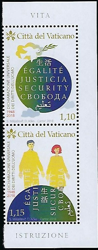 ![]() The Universal Declaration of Human Rights (UDHR) is an international document adopted by the United Nations General Assembly that enshrines the rights and freedoms of all human beings. Drafted by a UN committee chaired by Eleanor Roosevelt, it was accepted by the General Assembly as Resolution 217 during its third session on 10 December 1948 at the Palais de Chaillot in Paris, France. Of the 58 members of the United Nations at the time, 48 voted in favor, none against, eight abstained, and two did not vote. In 2022, all 193 member states of the United Nations have ratified at least one of the nine binding treaties influenced by the Declaration, with the vast majority ratifying four or more. While there is a wide consensus that the declaration itself is non-binding and not part of customary international law, there is also a consensus that many of its provisions are binding and have passed into customary international law, although courts in some nations have been more restrictive on its legal effect. Nevertheless, the UDHR has influenced legal, political, and social developments on both the global and national levels, with its significance partly evidenced by its 530 translations, the most of any document in history. ![]() Artist Svetlana Milijašević designed the miniature sheet of six stamps (3@€1,10 and 3@€1,15) to commemorate the 70th anniversary of the UDHR. Her design includes symbols such as the globe, a dove, and the figures of a man and a woman. Incorporated into some of the stamps are words in various languages such as liberty, security, life, justice, equality, and education. Technical Details: Scott Catalogue - 1696 - 1696M Date Issued - 09 November 2018 Face Value - €1,10 €1,15, 3 x €1,10 3 x €1,15 Perforations - 13x13.25 Printing Process - Offset Printer - Cartor (France) Max Printed - 60,000 |