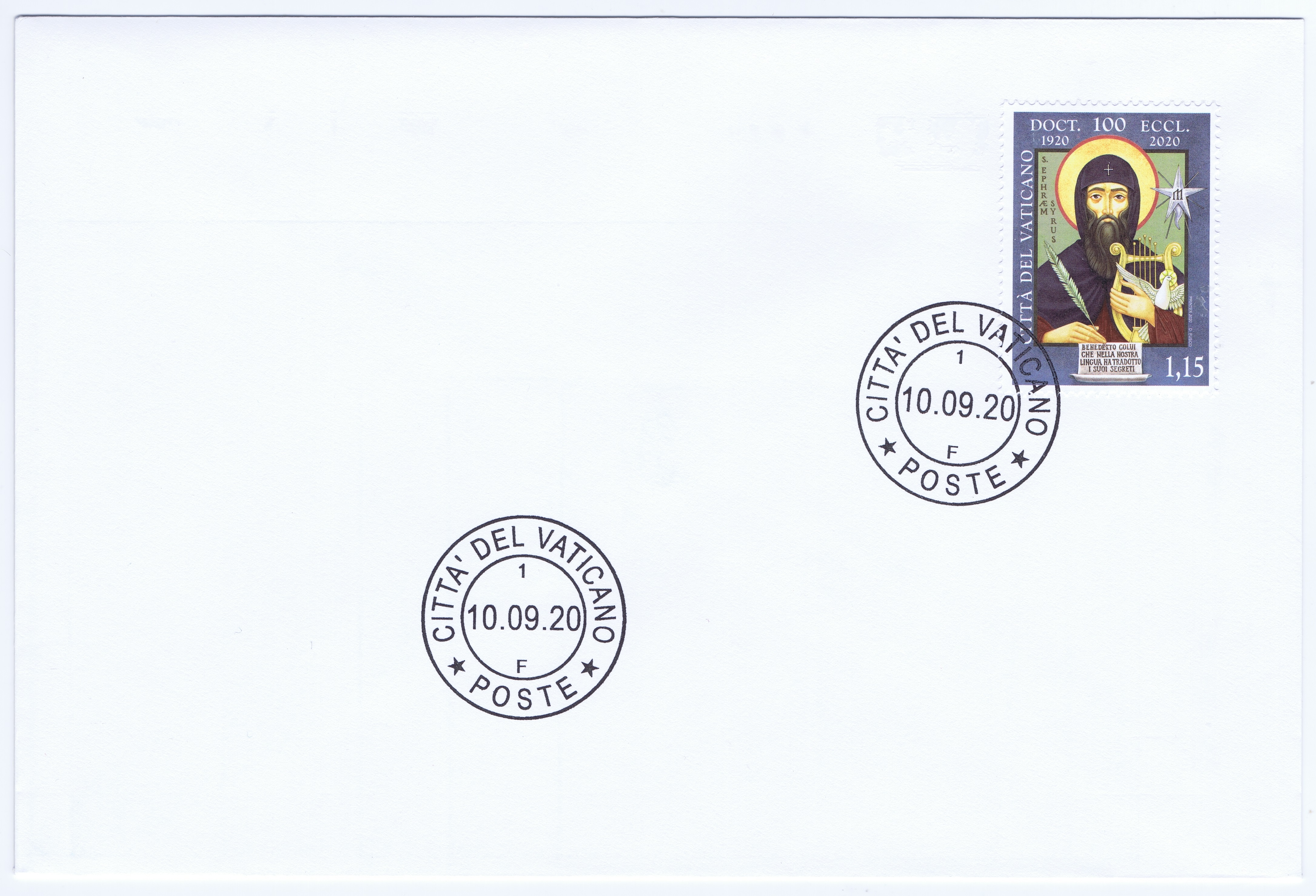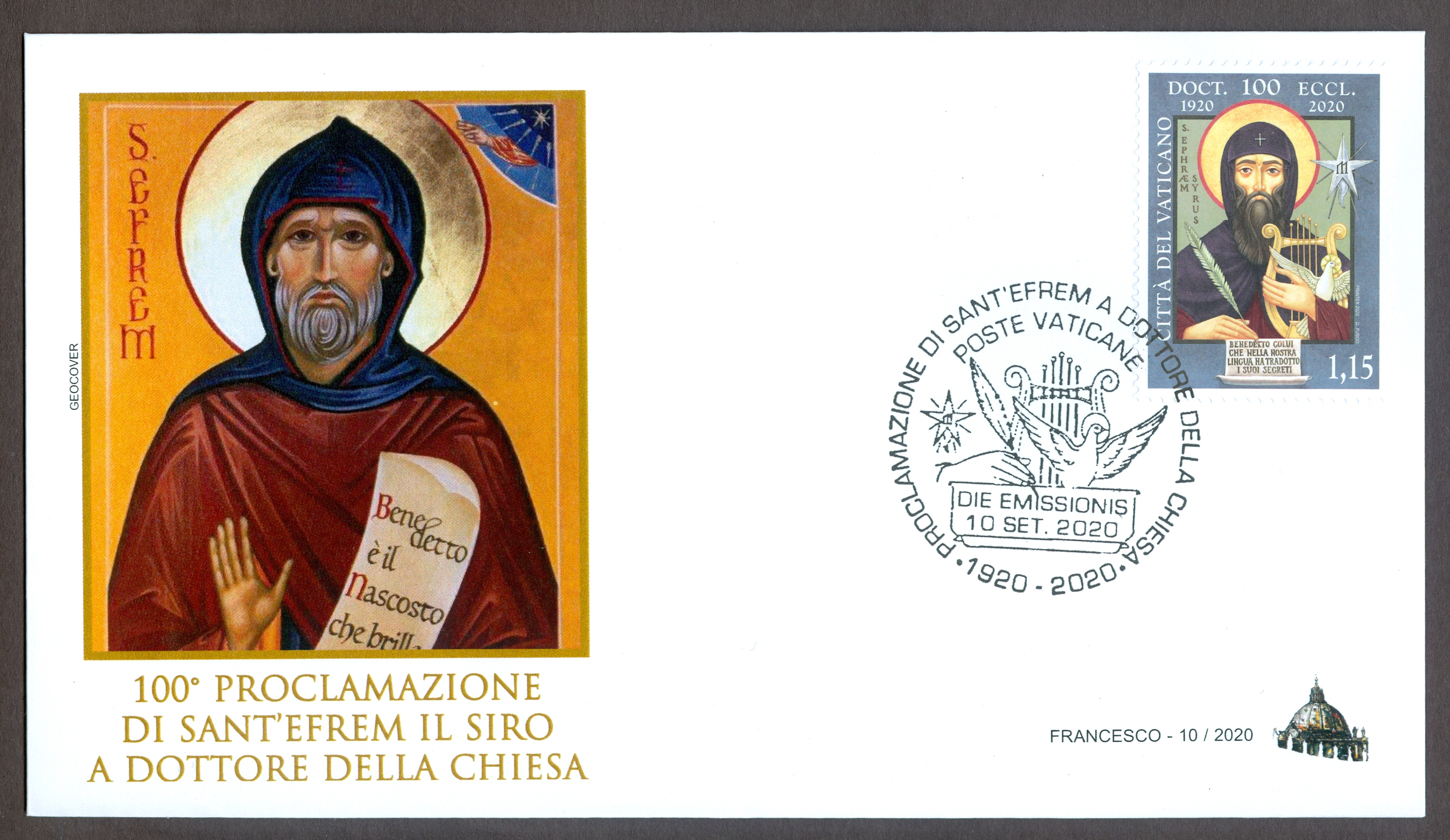 St. Ephrem (306-373) is known as the composer of hymns, poems, and verse in the Syrian dialect of Aramaic, a Galilean dialect of which was spoken by Jesus. He was a deacon and a representative of the Syriac Orthodox Church. Ephrem was proclaimed a Doctor of the Church by Pope Benedict XV in 1920. His feast day is 9 June in the West (probable date of his death) and 28 January in the Eastern Orthodox Church. He is considered the first "Marian doctor," who revealed the secrets of the Incarnation. St. Ephrem was born in Nisbis, Mesopotamia (today Urfa, Iraq) and settled in Edessa, the center of Syria Christianity. Ordained as a deacon, he is considered an ascetic rather than a monk. His hymns reinforced orthodox faith in the face of 4th century heresies. He also composed scriptural commentaries and a chronology covering the patriarchs to the Resurrection. Artist Daniela Fusco designed the €1,15 stamp. It is printed in sheets of ten. It depicts St. Ephrem with a dove and a lyre (or zither), both symbols of the Holy Spirit. A quill pen represents writing for his poems, hymns, and verse. A blue star with an "M" represents his devotion to the Virgin Mary. Technical Details: Scott Catalogue - 1745 - 1745 Date Issued - 10 September 2020 Face Value - €1,15 Perforations - 13.77x13.66 Printing Process - Offset, 4 colors Printer - Printex (Malta) Max Printed - 51,000 |