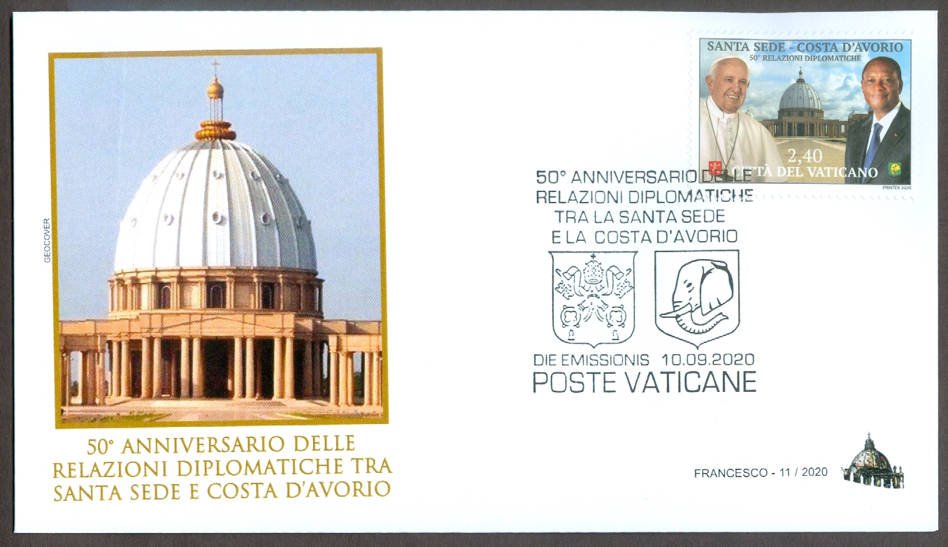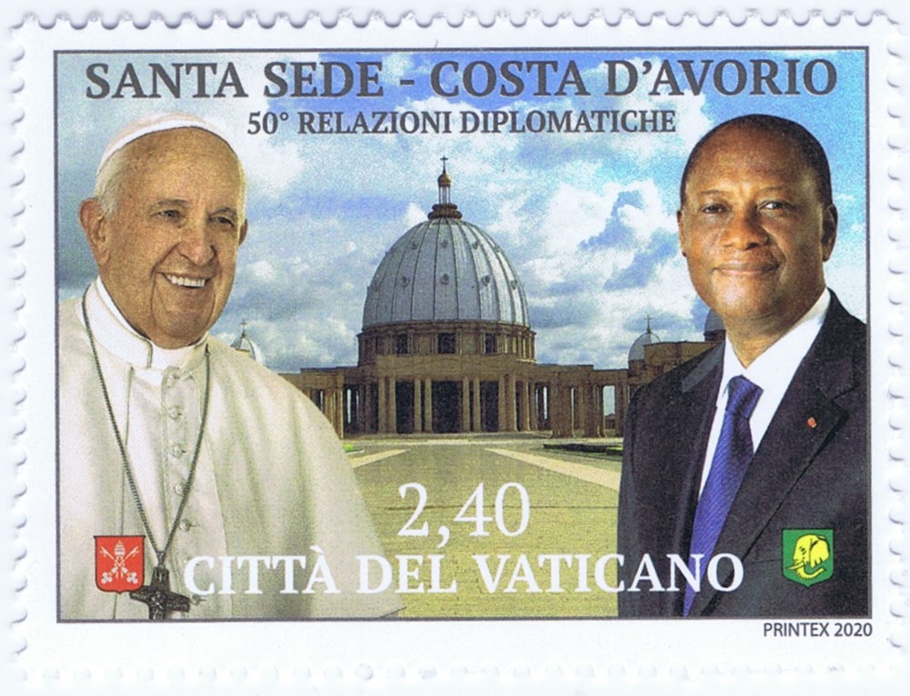 The Cote d'Ivorie (Ivory Coast) is a coastal republic in West Africa, independent of France since 1960. The name reflects commercial activity from the 15th and 16th century by Portuguese and French merchants. It's 26.4M population is 43% Muslim and 34% Christian (17.2% Roman Catholic). The Holy See and the Ivory Coast established diplomatic relations in 1970. The €2,40 stamp marks the 50th anniversary of the agreement signed by Pope Paul VI and Felix Houphouet-Boigny on 26 October 1970. The stamp depicts Pope Francis and then president Alassane Ouattara. In the background is the Basilica of Santa Maria della Pace in Yamoussoukro, built on the model of St. Peter's Basilica and consecrated by Pope John Paul II in 1990. The arms of both countries are also included in the design. The stamp is printed in sheets of ten. Technical Details: Scott Catalogue - 1746 - 1746 Date Issued - 10 September 2020 Face Value - €2,40 Perforations - 13.66x13.77 Printing Process - Offset, 4 colors Printer - Printex (Malta) Max Printed - 67,000 |