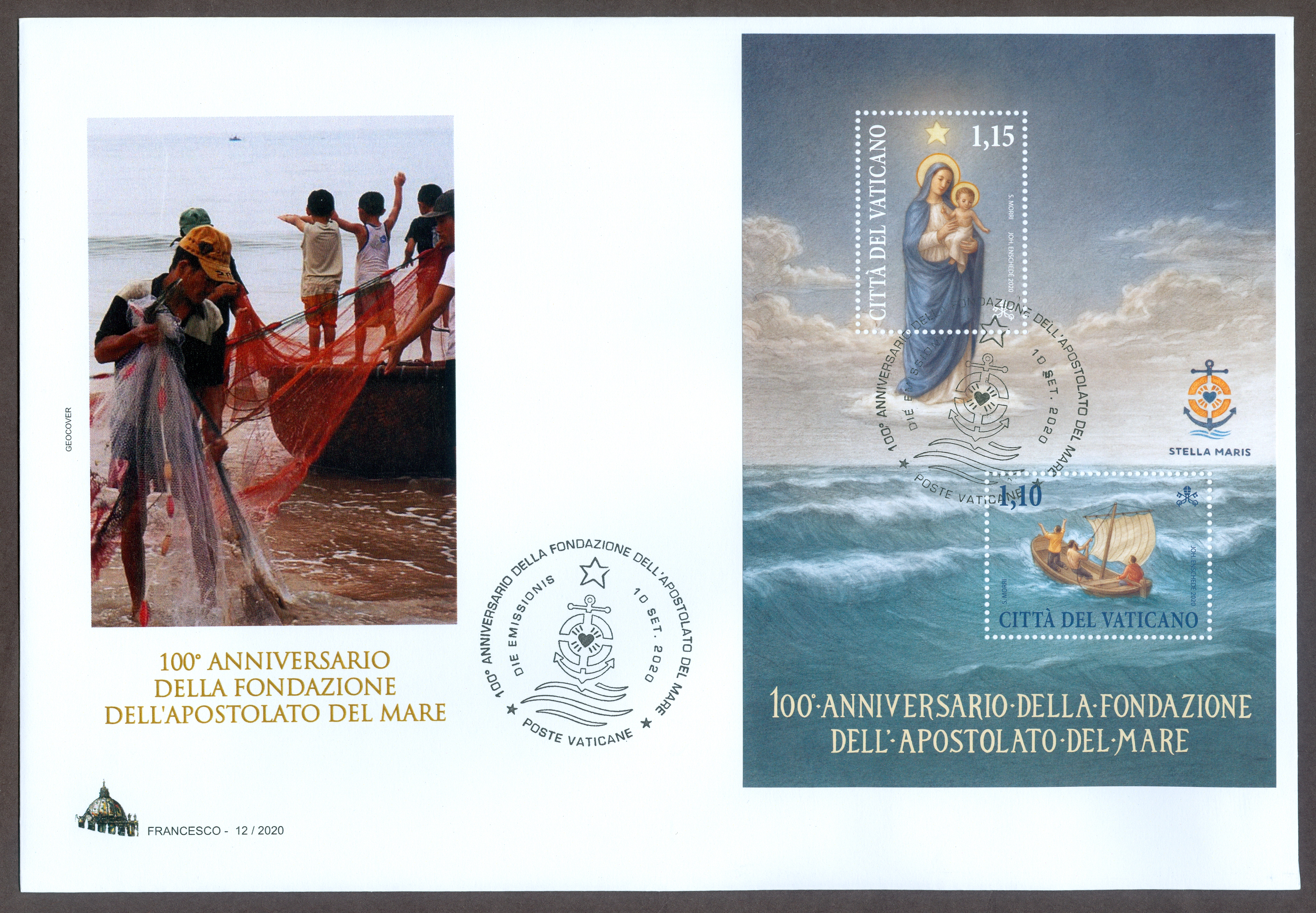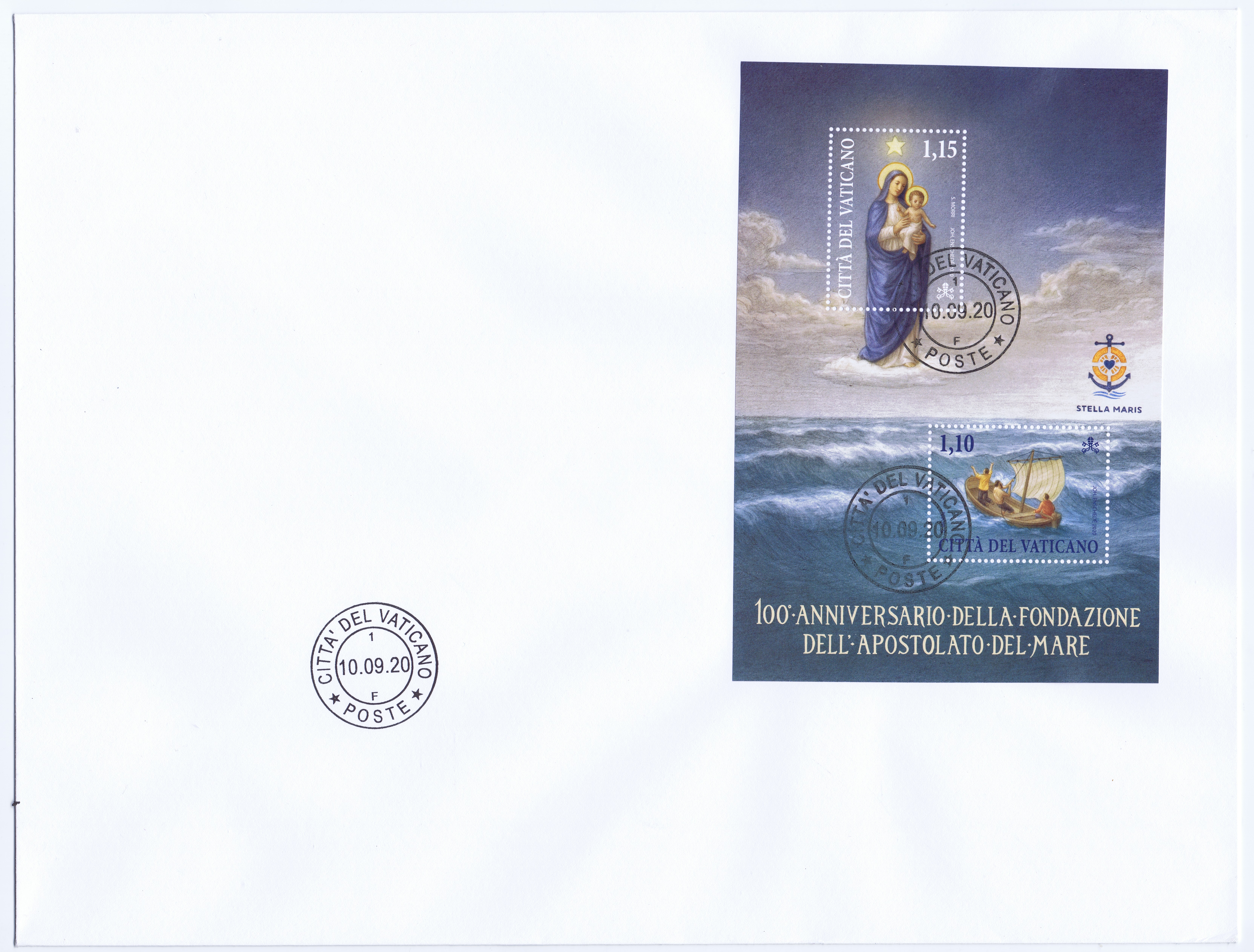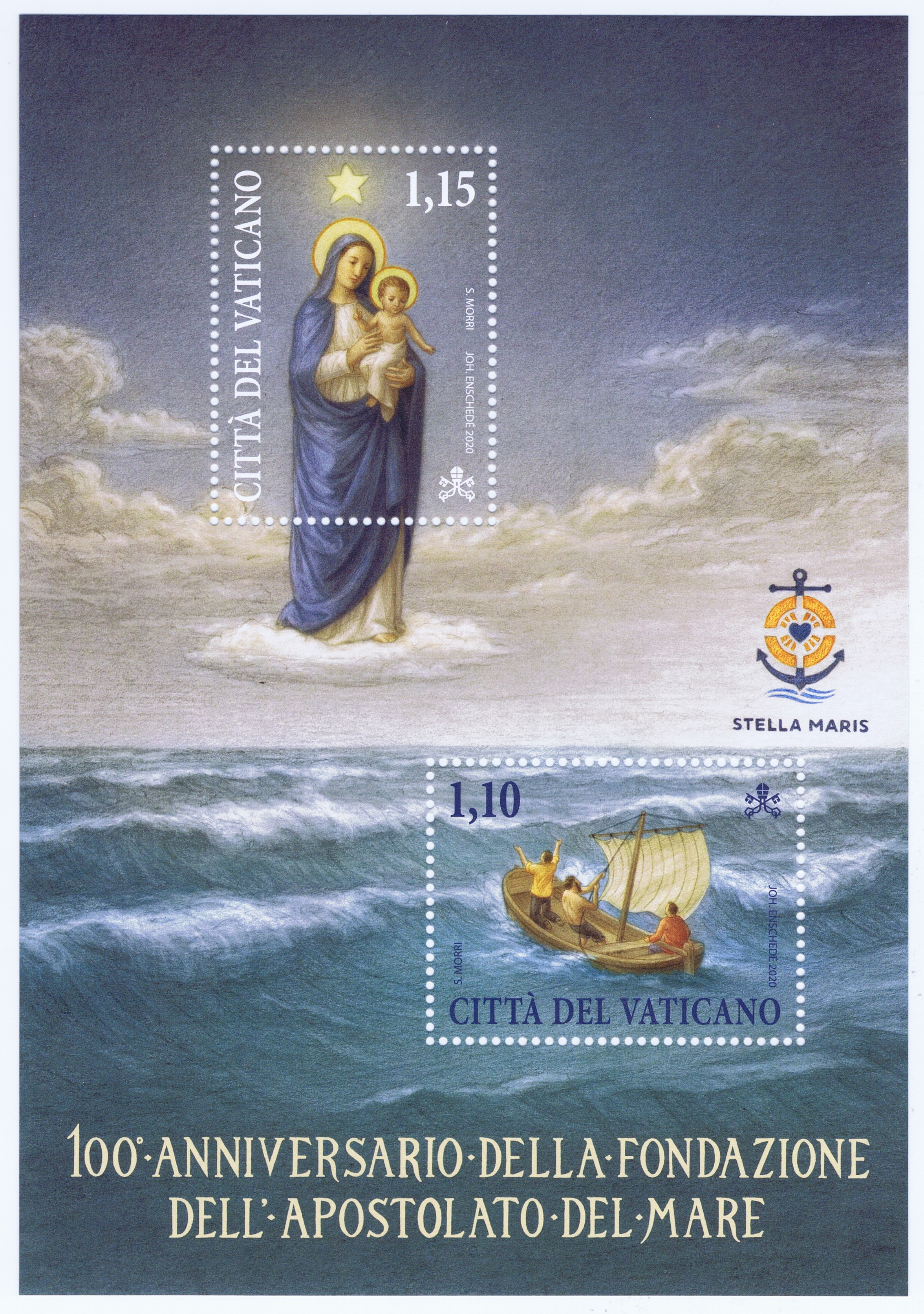 The Apostolate of the Sea is an agency of the Roman Catholic Church, often referred to as Stella Maris (Star of the Sea). It provides pastoral services, "a home away from home" to seafarers in over 300 seaports and over 55 countries located on all continents. Efforts to provide assistants to those who worked on ships began through independent efforts in various countries in the late 19th/early 20th centuries. The Society of St. Vincent de Paul was the first Catholic organization to initiate a program in Great Britain and Canada in 1890. The Apostolate of the Sea has an "episcopal partner" in each country who assists in providing volunteers to staff services. The AOS provides services without regard to religion or nationality. Volunteers staff hostels, coordinate religious services, and provide services to seamen who may be ill or are victims of human trafficking or other legal difficulties. Each year, on the second Sunday of July, the Catholic Church remembers seafarers and prays for them, their families and those who support them. 2020 marked the first centenary of the AOS, which was recognized in a miniature sheet containing €1,10 and €1,15 stamps, designed by artist Stefano Morn. The MIS includes the AOS coat of arms—an anchor intertwined with a life preserver and the Sacred Heart of Jesus. The €1,10 stamp depicts three persons in a boat invoking protection of the Blessed Mother shown on the €1,15 stamp. Technical Details: Scott Catalogue - 1747 - 1747 Date Issued - 10 September 2020 Face Value - €2,25 Perforations - 40x30mm & 30x40mm Printing Process - Offset, 4 colors Printer - Joh. Enschde' (Holland) Max Printed - 45,000 |