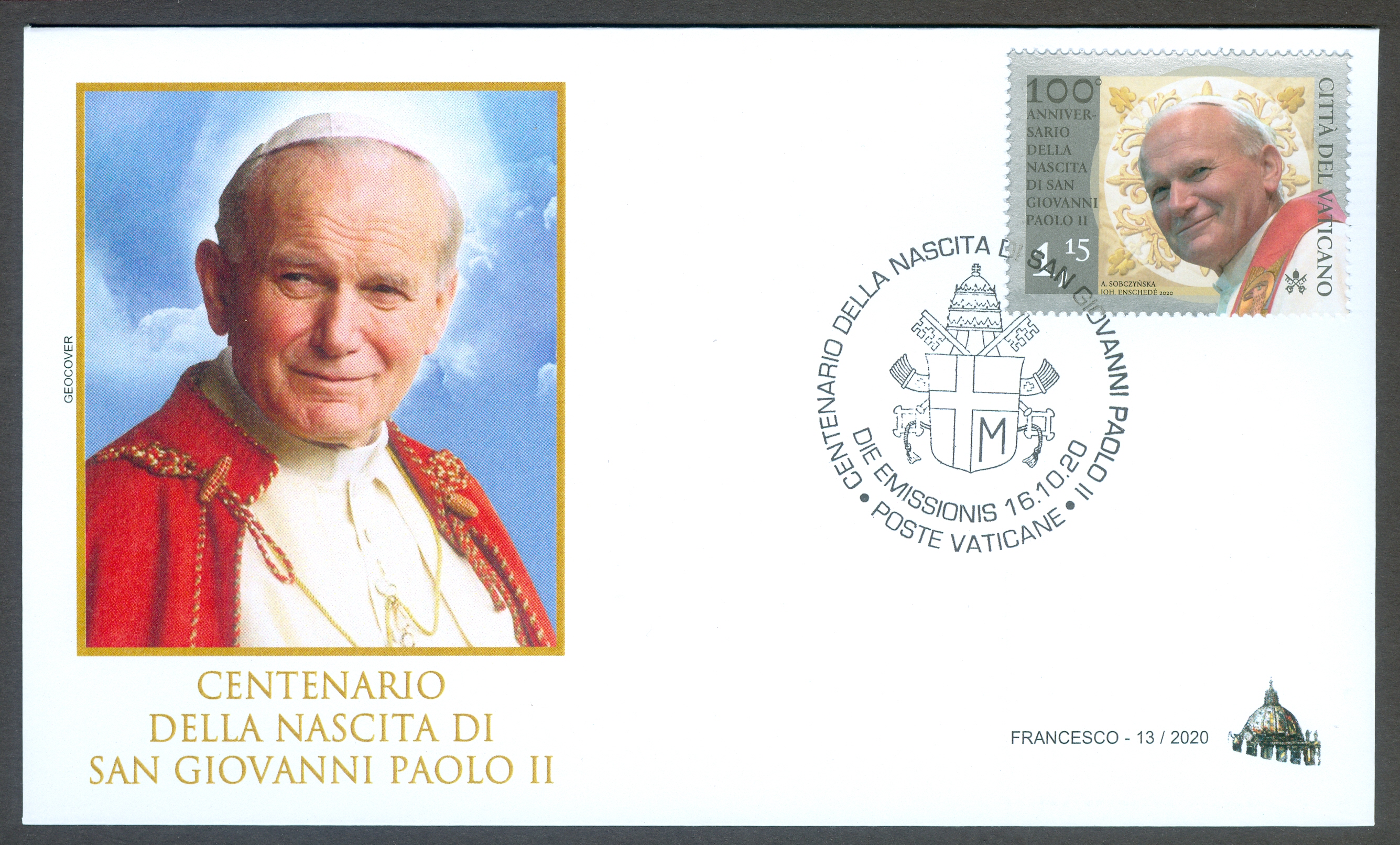 A miniature sheet, also a joint issue by Vatican City and Poland, marked the 100th anniversary of St. John Paul II's birth (18 May 1920). The MS includes six €1,15 stamps and six envelope seals. The stamp includes a photo from the pope's 1988 visit to Australia and the seals include photos of John Paul with his mother, with Stefan Cardinal Wyszynski, and as Pope John Paul II in St. Peter's Square. Artist A. Sobczyriska designed the MS.