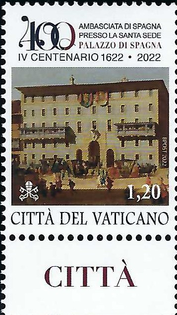 The Palace of Spain is a baroque palace that houses the Embassy of Spain to the Holy See for 400 years. The Embassy of Spain to the Holy See is the oldest embassy in the world. Its history is also the history of diplomatic relations between Spain and the Papal States. It established its premises in the Palace of Spain, located at Rome’s Piazza di Spagna square. The Piazza di Spagna (English: Square of Spain) is one of Rome’s most renowned squares. On September 8, 1857, Pope Pius IX inaugurated the Column of the Immaculate Conception that presides over the Piazza di Spagna in memory of the definition of the dogma of the Immaculate of which Spain was a tenacious defender for centuries. ![]() The stamp issued for the occasion of the 400th anniversary by comes in a miniature sheet of five €1,20 stamps, featuring a painting of the impressive Palace by Giovanni Paolo Pannini made in 1727, displayed in Apsley House in London. The official logo designed by the Embassy for the anniversary related celebrations appears next to the title of the stamp issue. Technical Details: Scott Catalogue - 1805 - 1805M Date Issued - 16 November 2022 Face Value - €1,20 Perforations - 11.5 Printing Process - Offset, 4 colors Printer - BPost (Belgium) Max Printed - 27,500 |