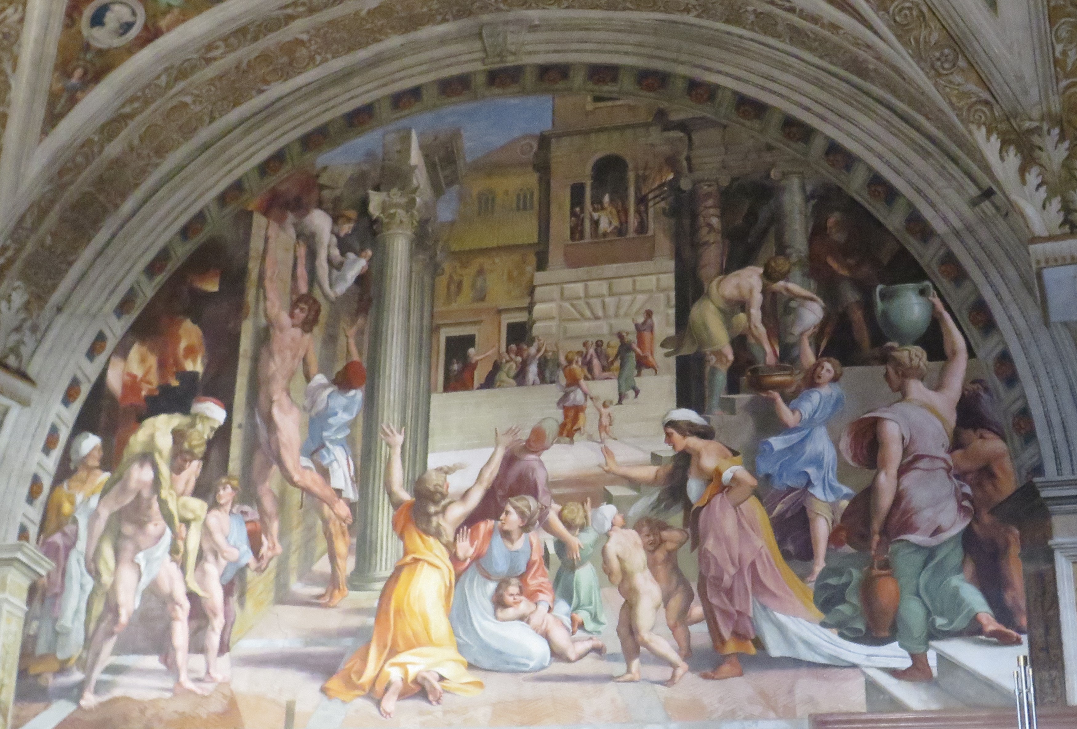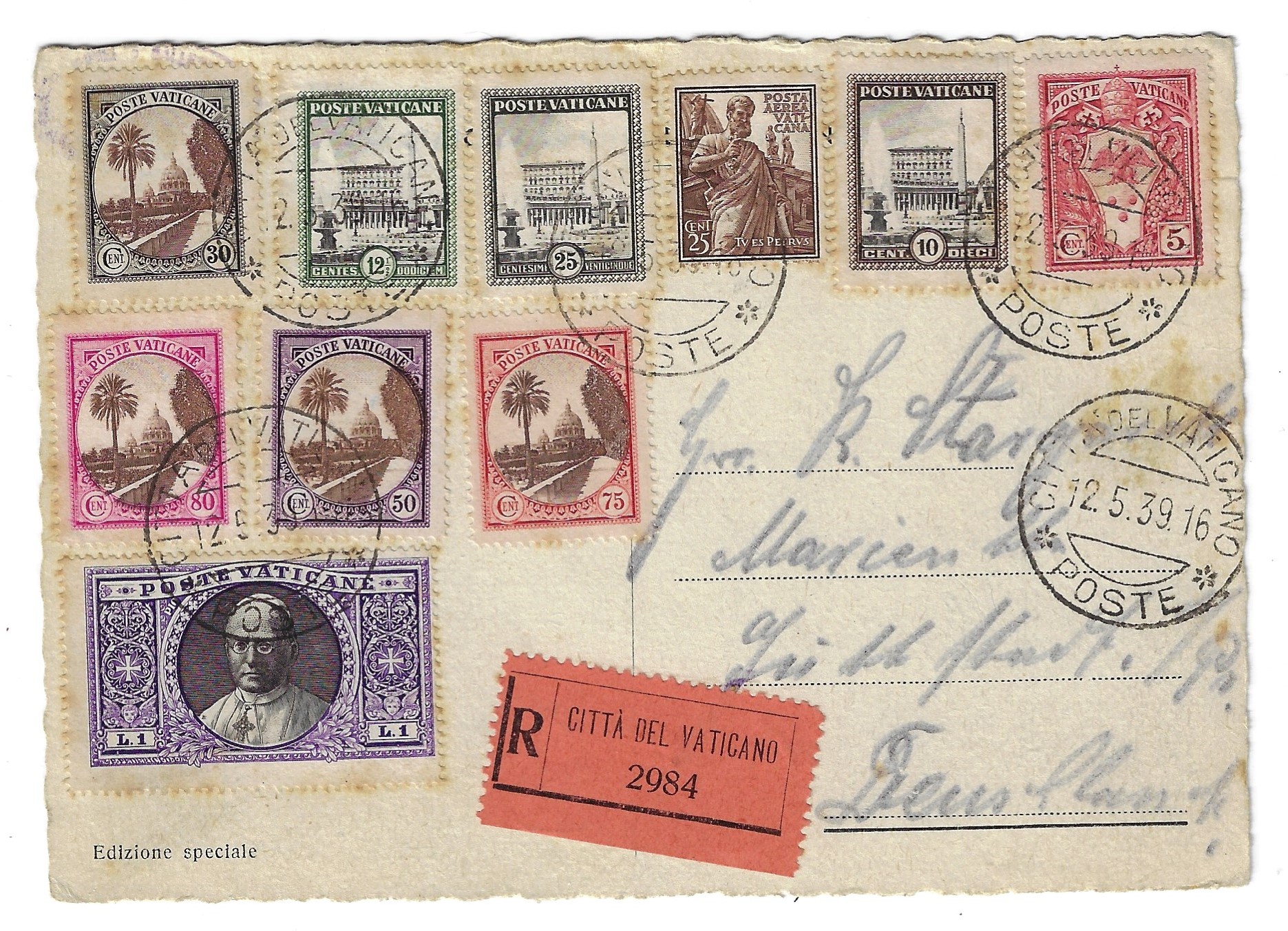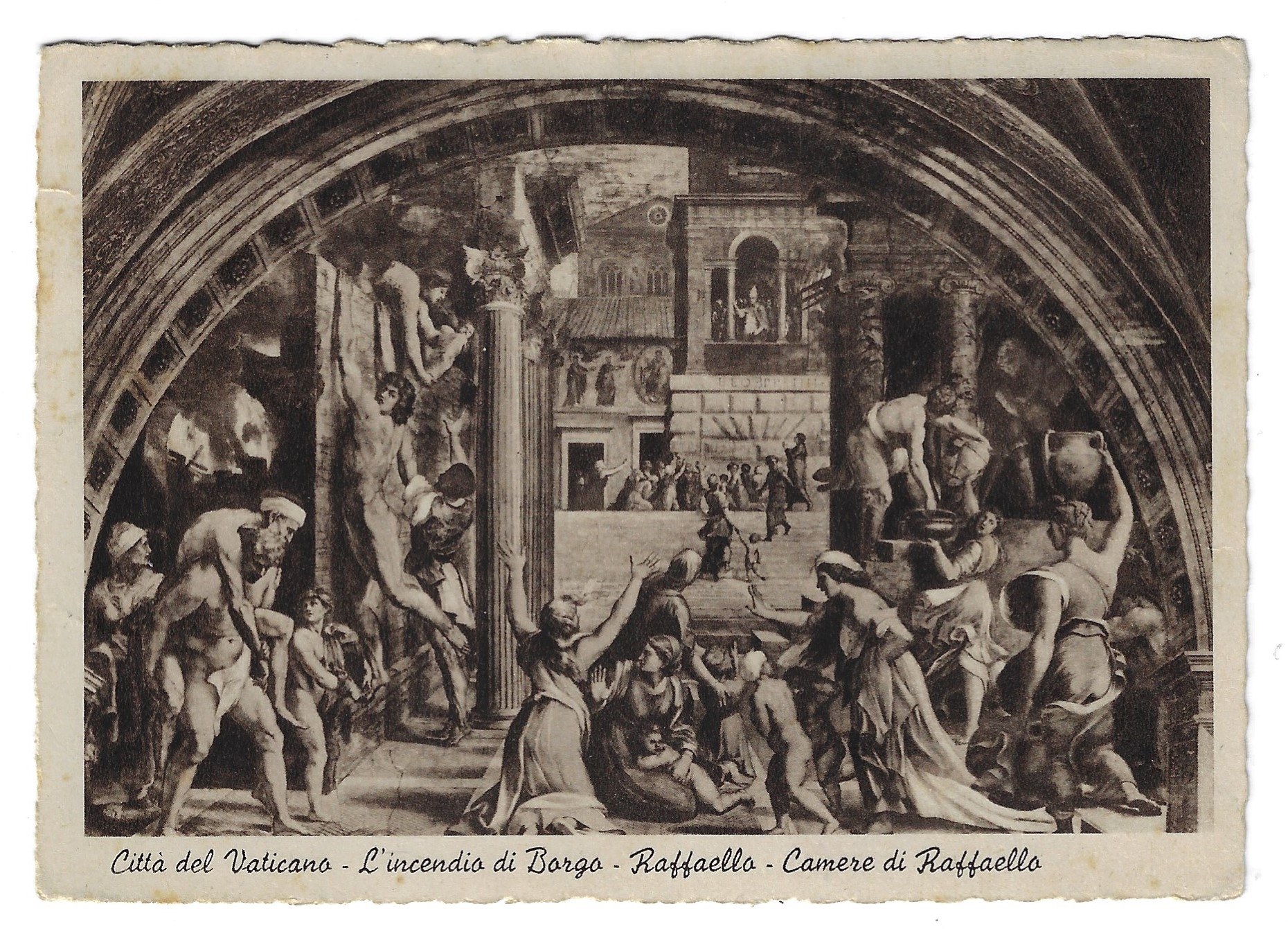 ![]() Raphael Sanzio: 5th Centenary of Death Scott 1744b (2020) In 847, a disastrous fire broke out in the district in front of the ancient Basilica of San Pietro (St. Peter's), known as the Borgo. Christian legend has it that Pope Leo IV imparted a solemn blessing from the Loggia Delle Benedizioni and the fire was miraculously put out. Thus the population and the basilica were saved. Around 1514, Raphael painted a fresco of the event which is now housed in the Stanze di Raffaell in the Apostolic Palace of the Vatican Museums. ![]() This color photograph of Raphael's The Fire in the Borgo fresco was taken in September of 2022 while I was at the Vatican Museums. The 1939 postcard below pictures Raphael's The Fire in the Borgo. It is assumed that Raphael made the designs for the complex composition; however, the fresco was most likely painted by his assistant Giulio Romano. ![]() ![]() This registered postcard is postmarked on May 12, 1939. The stamps used on this postcard are mostly from the 1933 Gardens & Medallions issue. The exception is the 25c 1938 air postage stamp showing the statue of St. Peter (top row, fourth stamp from the left). The card has a 1 lire stamp of Pope Pius XI on the bottom row. Pope Pius XI died on February 10, 1939, and by the time of the mailing of this card, Pope Pius XII had started his papacy (March 2, 1939). The 1 lire stamp continued to be sold up until December of 1940 according to the Bolaffi catalog. Some of Gardens & Medallions issues, according to the Bolaffi catalog, continued to be used as valid postage until 1947. References |
