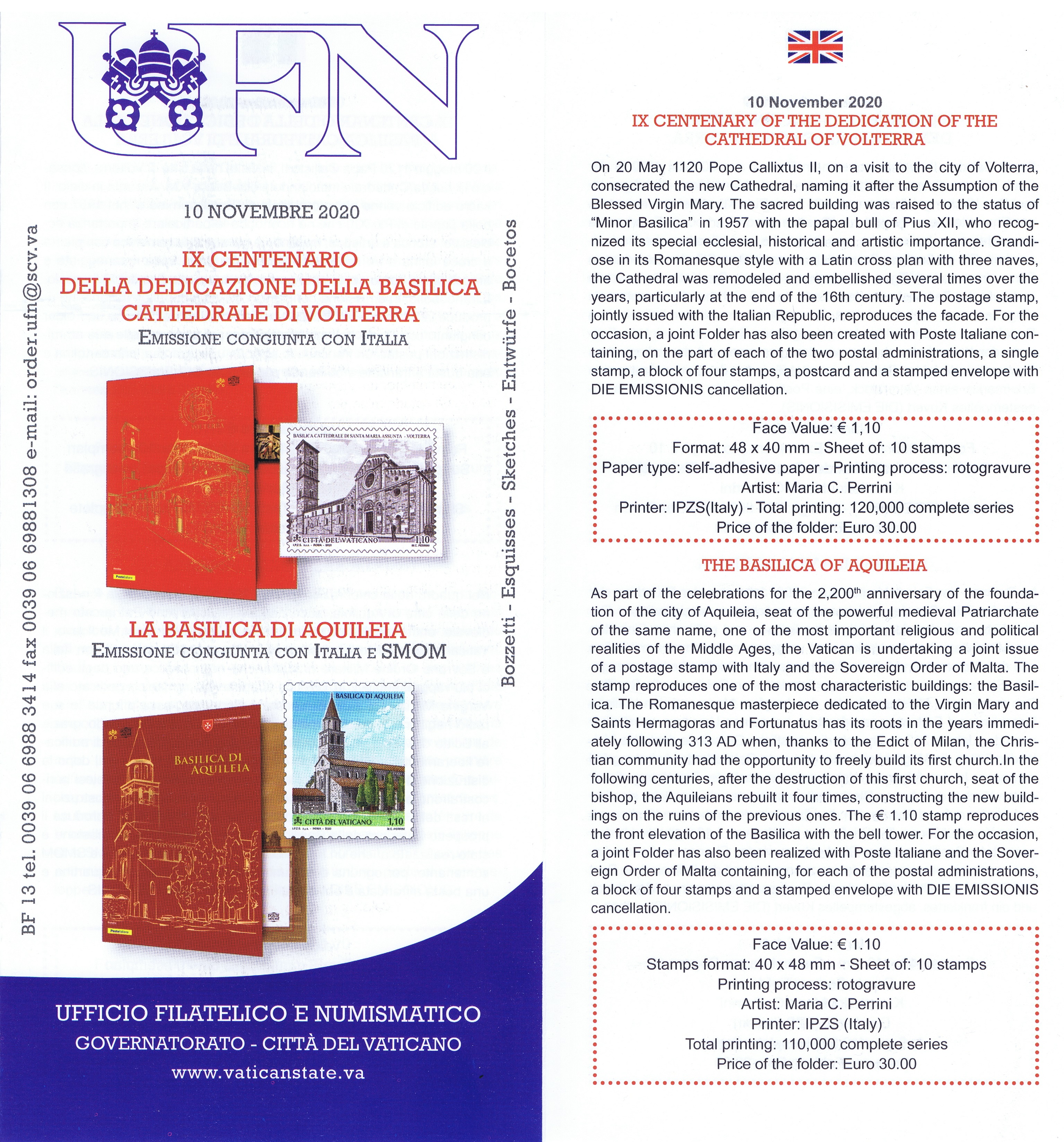 ![]() Basilica Cathedral at Volterra Scott 1750 (2020) In 2020, Vatican City issued two stamps honoring basilicas in Italy. One of those stamps commemorates the 9th centenary of the dedication of the Cathedral of Volterra. The stamp (shown above) depicts the facade of the Cathedral and was part of a joint issue with Italy. On May 20, 1120, Pope Calixtus II consecrated the Volterra Cathedral or Cattedrale di Santa Maria Assunta (Cathedral of the Assumption of the Virgin Mary). The Cathedral had been rebuilt following the earthquake of 1117 that destroyed most of the town of Volterra, including the original church (which had been built in the 9th century). ![]() Cattedrale di Santa Maria Assunta, Volterra, Tuscany, Italy Photo by Davide Papalini (2010) From Wikimedia Commons, Used under the terms of the Creative Commons Attribution-Share Alike 3.0 Unported license The Cathedral is in the Romanesque style with a Latin Cross plan with three naves. It has been remodeled several times over the years. A major renovation, started in 1580, included the decoration of the intricately coffered ceiling of the nave and crossings. The elongated nave spans 22 columns, which are decorated with stucco simulating rose-colored granite. The campanile or bell tower to the left of the facade was built in 1493, replacing an older bell tower.