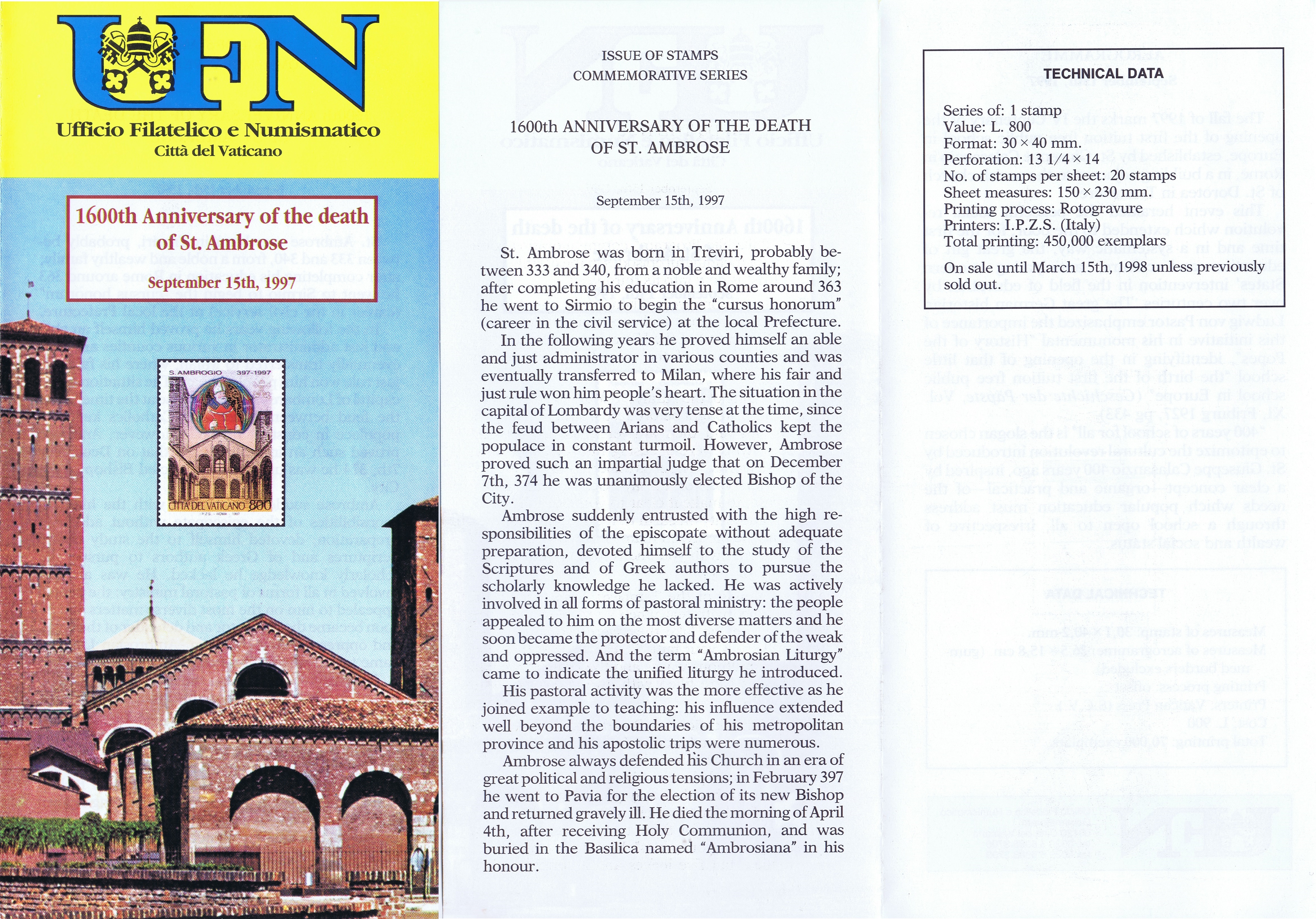 ![]() Saint Ambrose: 1600th Anniversary of Death Scott 1051 (1997) December 7 marks the Feast of Saint Ambrose, the fourth century theologian, statesman and Bishop of Milan who would be named one of the early Doctors of the Church. Ambrose (ca. 334/340-397) was the son of the praetorian prefect of Gaul, born in Trier, who was appointed governor of the province of Aemilia and Liguria, the capital of which is Milan. In 374 the see of Milan was vacant and Ambrose was chosen by acclamation of the people as bishop although at that time he was only an unbaptized catechumen. He tried to refuse the honor but eventually accepted it. Milan was a very important see and an administrative center for the western part of the Roman Empire. As bishop, Ambrose faced many problems, including dealing with the heresy of Arianism and a Roman society in which Christianity was still a minority faith. He refused to hand over a building to Arians for worship as ordered by the empress-regent. When rioters killed a Roman governor at Salonika and Emperor Theodosius I ordered a savage massacre, Ambrose then ordered public penance by the emperor. He persuaded emperor Valentinian II to not restore the goddess of victory to the Senate House in Rome. Therefore, as bishop, Ambrose’s influence spread far beyond Milan and his archiepiscopal duties. Suggestions that the Ambrosian Creed, Rite, and Chant can be directly traced to St. Ambrose are disputed. However, Ambrose was one of the first to make use of hymns both to praise and to foster belief, such as the Te Deum. His primary writings are as a catechist, such as instructions on baptism, confirmation, and the Eucharist. Ambrose is one of the four early Doctors of the Church, along with Jerome, Gregory the Great, and Augustine. His relics were transferred to the Cathedral of Milan in 835 (Duomo di Milano dedicated to the Nativity of Mary). His symbols are vestments with the emblem of a scourge, representing the penance imposed on the emperor, suggesting the emperor is within the church and not above it. Another symbol is a beehive said to represent his eloquence as a speaker. The stamp issued by Vatican City in 1997 to commemorate the 1600th anniversary of the death of Saint Ambrose has a depiction of the Saint above an image of the Basilica of Sant'Ambrogio in Milan. Here is a photo of the Basilica as it appears today: ![]() Basilica of Sant'Ambrogio, Milan, Italy Atrium and Entrance Portico Photo by Ludvig14 From Wikimedia Commons Used under terms of the Creative Commons Attribution-Share Alike 4.0 International license REFERENCES: |