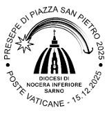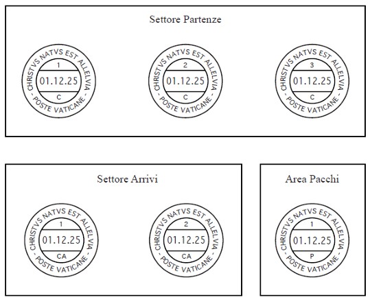 ![]() 2025 Christmas Stamps and Booklet Cover 2025 Christmas Stamps: released on November 7, this year’s stamp design is taken from the "Adoration of the Shepherds”, a 16th-century work by the Flemish master Pieter van Aelst. The original piece, a tapestry woven from drawings from the school of the Renaissance master Raphael, is housed in the Vatican Museums. The two stamps were issued in sheets of ten each, as well as in booklet format, with the booklet page consisting of two each of the 1.30-euro and 1.35-euro stamps. ![]() Christmas Season Postmarks Ordinary Postal Cancellations for the Christmas Season: unveiled on December 1, 2025, and to be used through January 10, 2026, the circular postmarks shown above are used to cancel all postal correspondence during this period. The “C” in the lower moon is for “Settore Partenze” (departing mail), the “CA” indicates “Settore Arrivi” (arriving mail) and “P” is for “Area Pacchi” (parcels). The imprint “Christus natus est Alleluia” announces “Christ Is Born Alleluia”. ![]() Nativity Scene Postmark Inauguration of the Nativity Scene in Saint Peter’s Square: in a departure from past years, the Vatican introduced a special postmark to commemorate the unveiling of the nativity scene and the lighting of the Christmas Tree in Saint Peter’s Square on December 15, 2025. A brief video of this event can be viewed by clicking on the link in the References. ![]() Christmas Day Postmark Christmas Day Postmark: first shown on December 15, the postmark is modeled after the image on the 1.35-euro Christmas stamp showing the Baby Jesus and the Blessed Mother. The postmark is used to cancel the stamps found on the envelopes in the annual Christmas folder, which contains two envelopes, each franked with one of this year’s Christmas stamps. The press release does not indicate whether this postmark is used for any other purpose other than to cancel the stamps on these post office-issued envelopes. REFERENCES: |