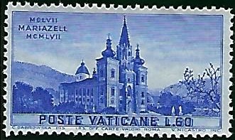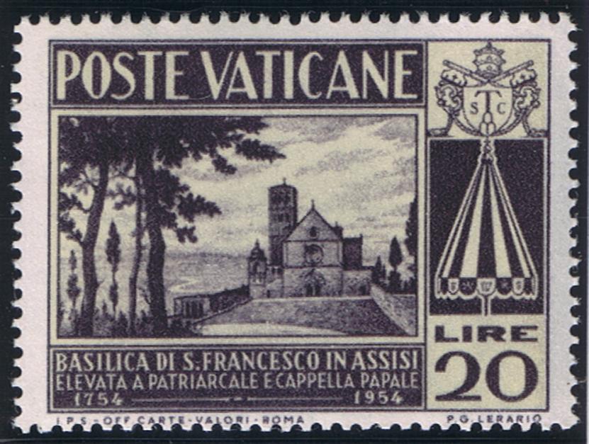 To commemorate the second centenary of the elevation of the Basilica of St. Francis to the rank of Patriarchal Basilica the Vatican Postal Administration released a set of two commemoratives on Oct. 1, 1954. The stamps were the work of P. G. Lerario, of the Order of Friars Minor. They were released in post Office sheets of 40 stamps and were printed at the State Printing Office, Rome, by the photogravure method.