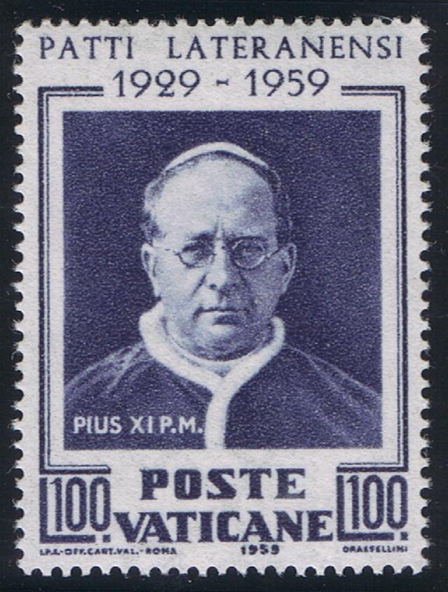 To commemorate this important treaty, the Vatican Postal Administration released a set of two stamps depicting Pope Pius XI and a view of Vatican City. The stamps were placed on sale on February 12, 1954, to mark the silver anniversary of the signing. The stamps could not be released on the actual anniversary date as it was a Holiday and the post office was closed. Italy also marked the signing of the Lateran Pact with a set of two stamps depicting the Lateran Palace where the treaty was signed.