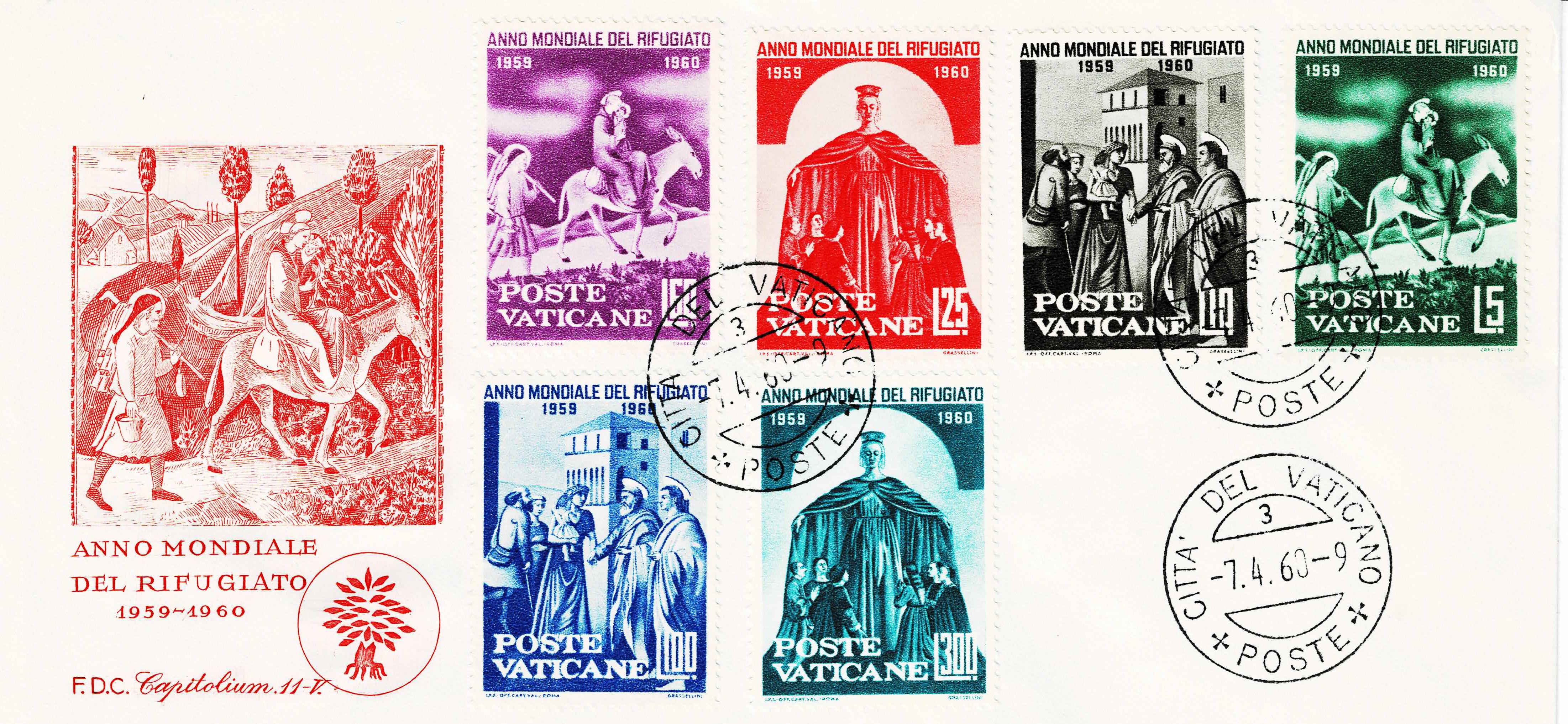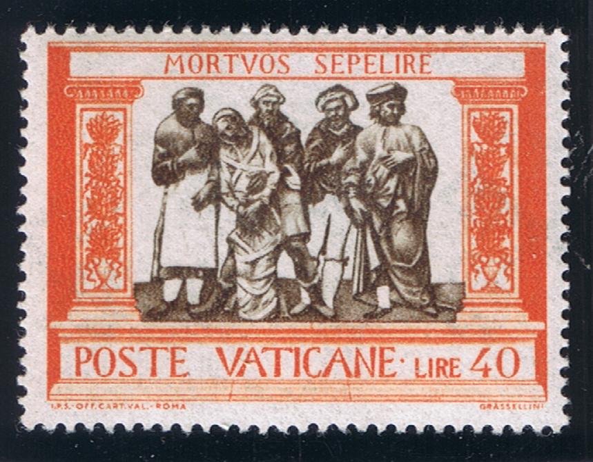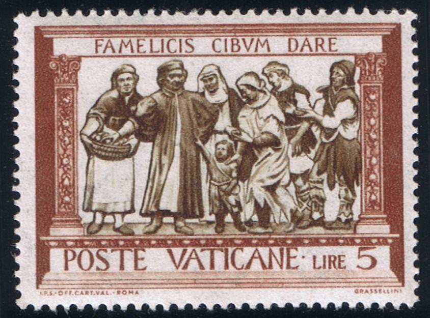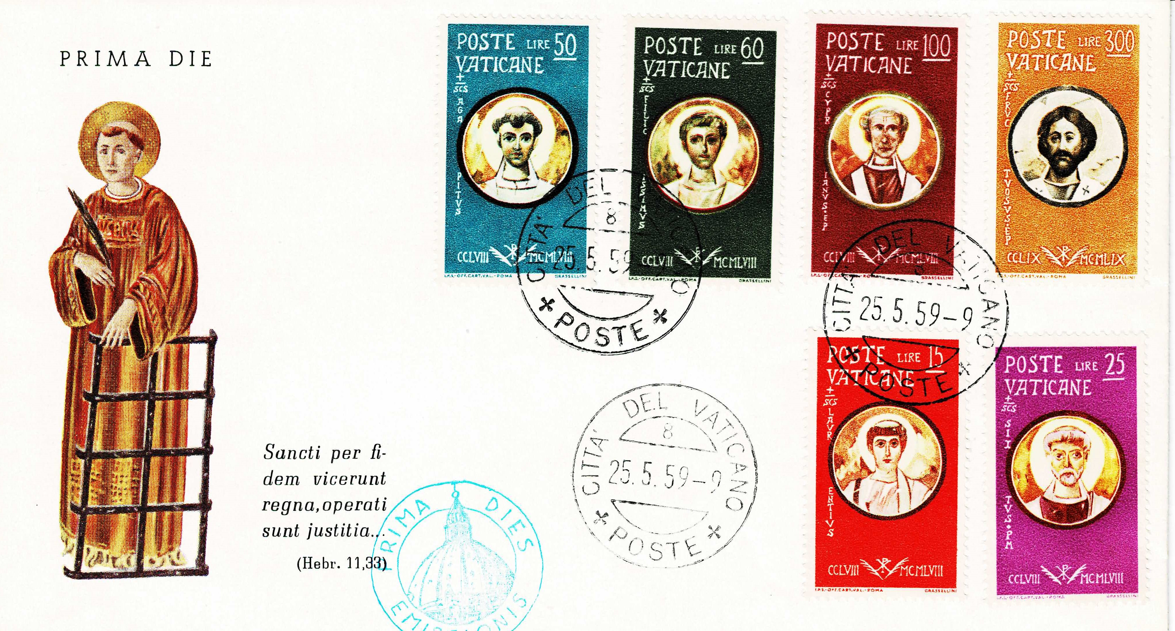 Edmondo Pizzi use a detail of the fresco, "The Farewell of St. Lawrence", for the design of the stamps. This painting was executed by Fra Angelico and, like the fresco used for the Fra Angelico commemoratives, is found in the Chapel of Pope Nicholas V in the Vatican Museums.