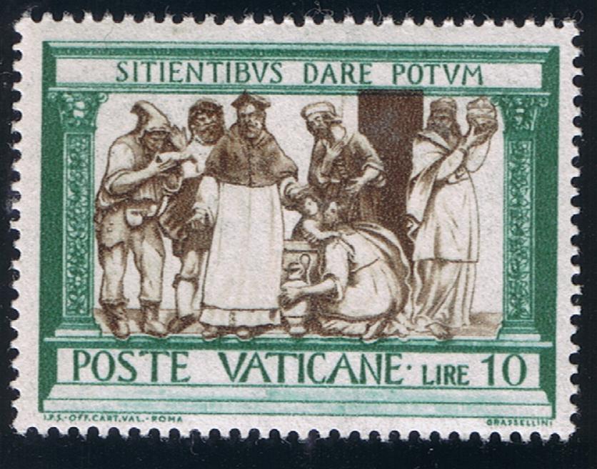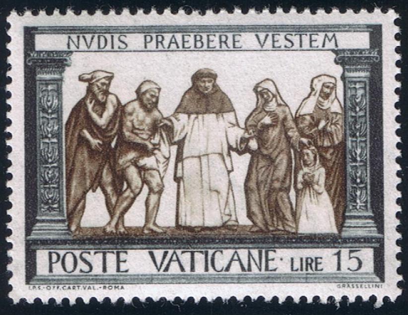 The inexhaustible talents of this famous saint were not limited to preaching and writing. He introduced community life in his Episcopal See that is followed even today by many religious orders, the most prominent being the Augustines and the Dominicans. On August 28, 430, Augustine departed from this world to a new life in heaven. In 1295, Pope Boniface VIII declared him a doctor of the Church. The date of his death was proclaimed his feast day and is so celebrated throughout the universal Church. Vatican City has maintained a practice of honoring great saints on the anniversary of their death. This precedent was broken however when a set of two commemoratives, 35 Lire, and 50 Lire, was placed on sale on November 13, 1954, to mark the 16th Centenary of the Birth of St. Augustine of Hippo. The design of the stamps were executed by the noted Vatican designer, Edmondo Pizzi. Mr. Pizzi obtained his inspiration for the design from a painting by Botticelli, "St. Augustine in Meditation", in the Church of San Salvadore d'Ognissanti (All Saints) in Florence, Italy. Mr. Pizzi added an open book to the original with the wording, "Tolle Lege", (Take and Read) as well as the necessary wording and country identification.