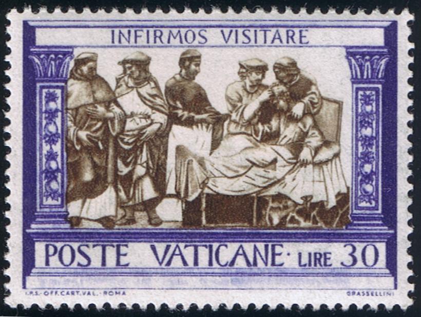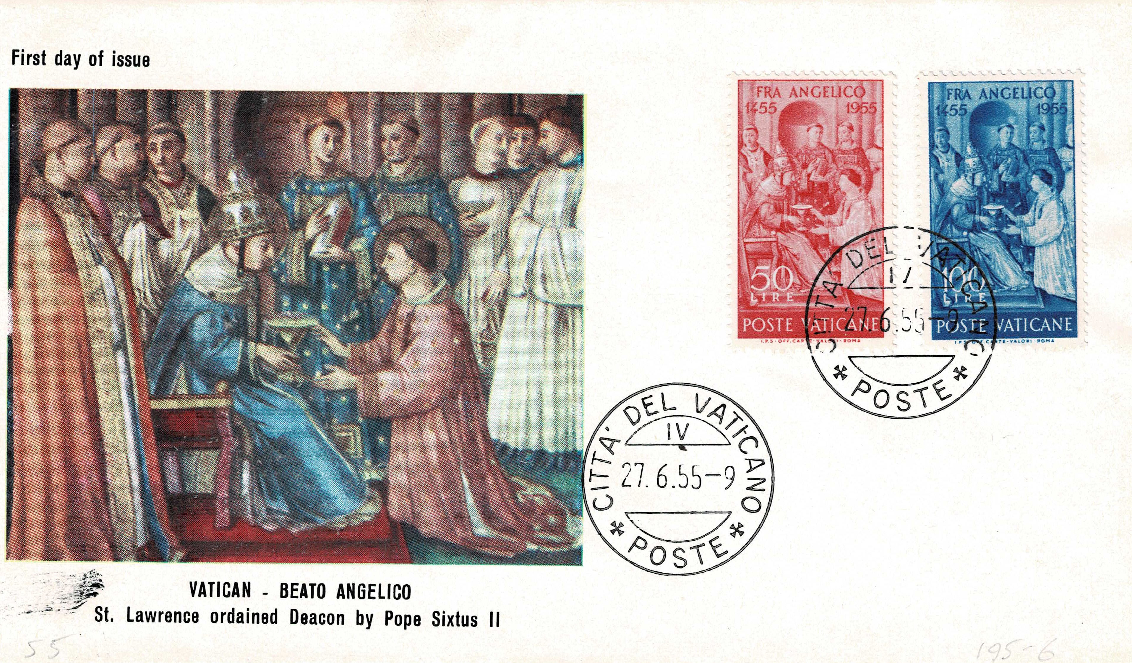 In 1448, at the request of Pope Nicholas V, successor of Eugenius IV, Fra Angelico was commissioned to paint a series of frescos depicting scenes in the lives of Saints Stephen and Lawrence. It was from this series, the last executed by Fra Angelico, that the design of the stamps was taken. The scene, depicted on the stamp, is St. Lawrence being ordained Deacon by Pope Sixtus II. So faithfully has the center of this fresco been reproduced on the stamps that we can say that Fra Angelico was the designer of the stamps marking the anniversary of his death.