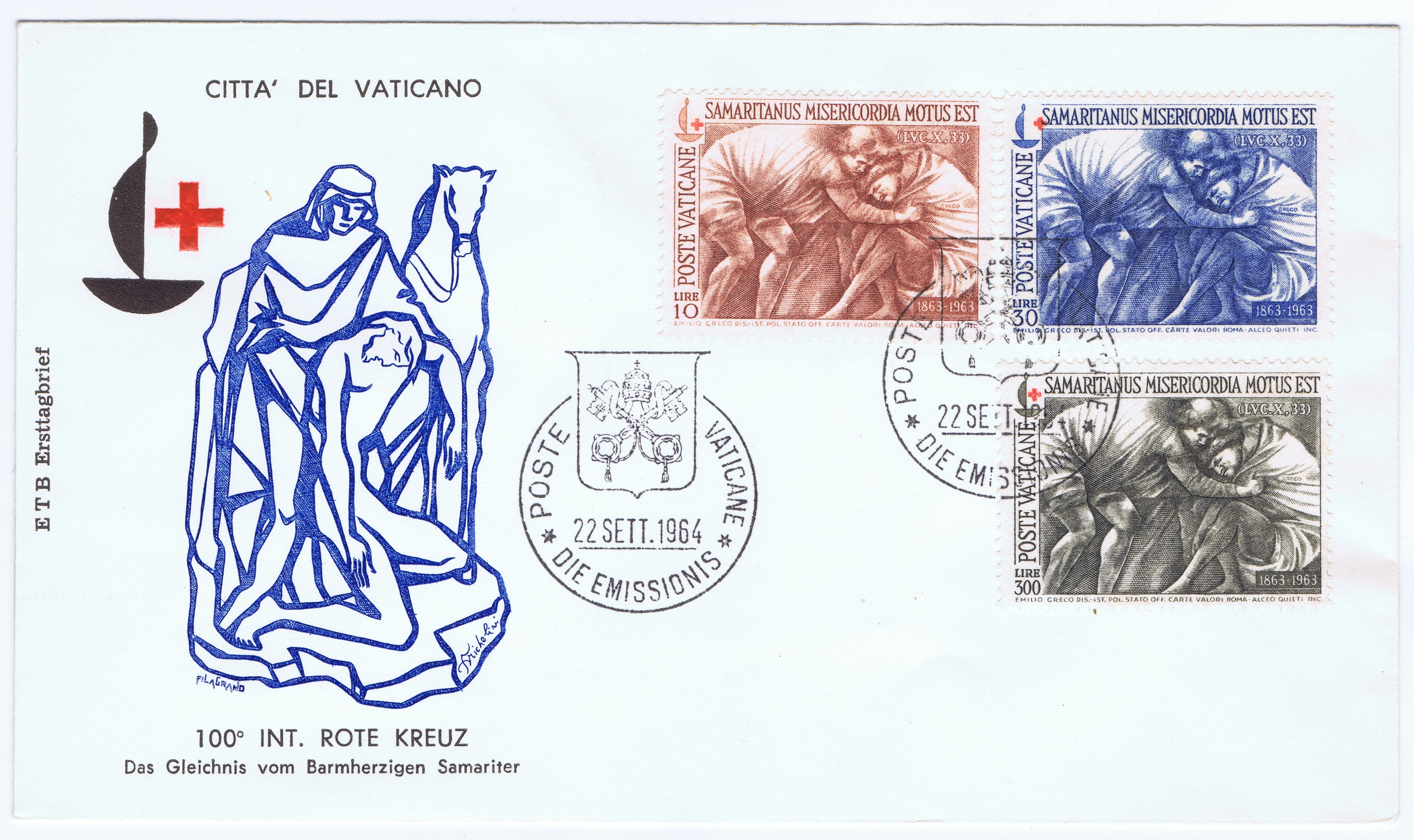 On July 2, 1965, the Vatican issued two stamps commemorating St. Benedict, founder of the Benedictines. Both stamps bear the inscription: "In the restored Cassino monastery, Paul VI declared St. Benedict the patron of Europe in the year 1964." The FD special cancel reads: "He, who was the teacher of the peoples of Europe of peace, unity and civil culture by the cross, book, and plow, was made` patron to the same peoples by Pope Paul VI". St. Benedict appears on the 40 Lire and the Abbey of Monte Cassino on the 300 Lire.