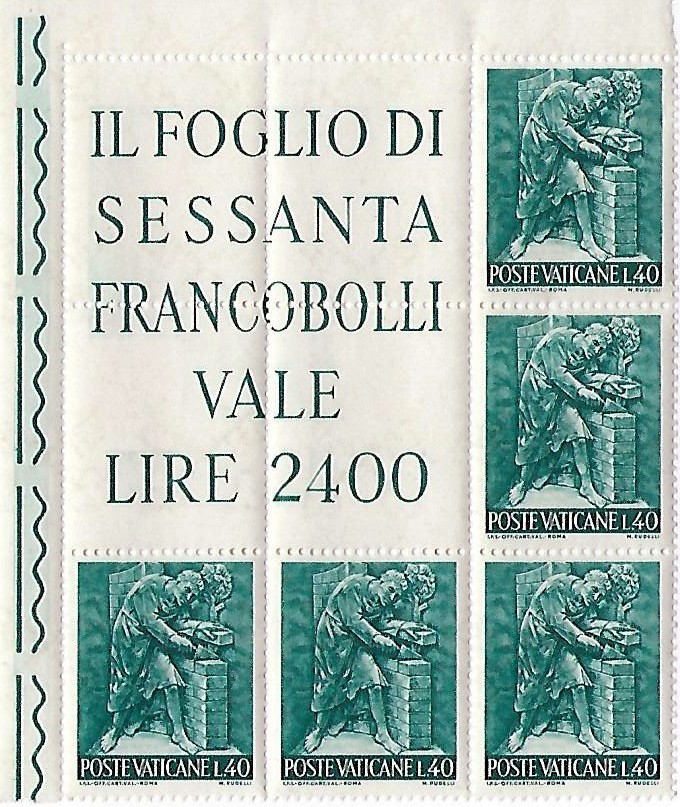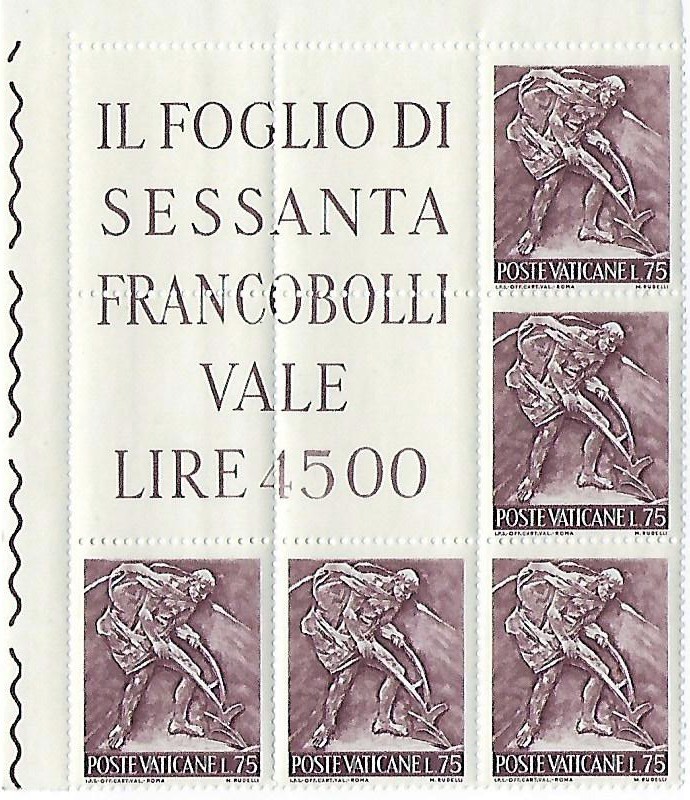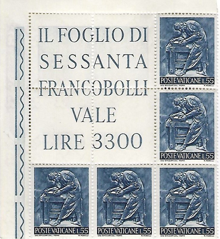 The designs include the names of each institution. Along the bottom of the stamps are the words POSTE VATICANE as well as the denomination. The illustrations were based on sketches by Professor Lino Bianchi Barriviera. They were engraved by G. Verdelocco, M. Codoni, V. Puliti and F. Borrelli, respectively. The stamps are horizontal in format, measuring 48 x 40 mm., and are perforated 14 x 14. They were produced on white chalky paper in multicolored offset, recess, and photogravure, and were issued in sheets of 25. 900,000 complete series were printed by the Italian State Polygraphic and Mint.