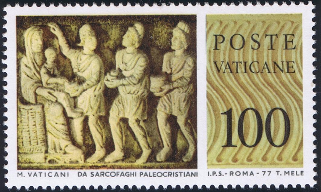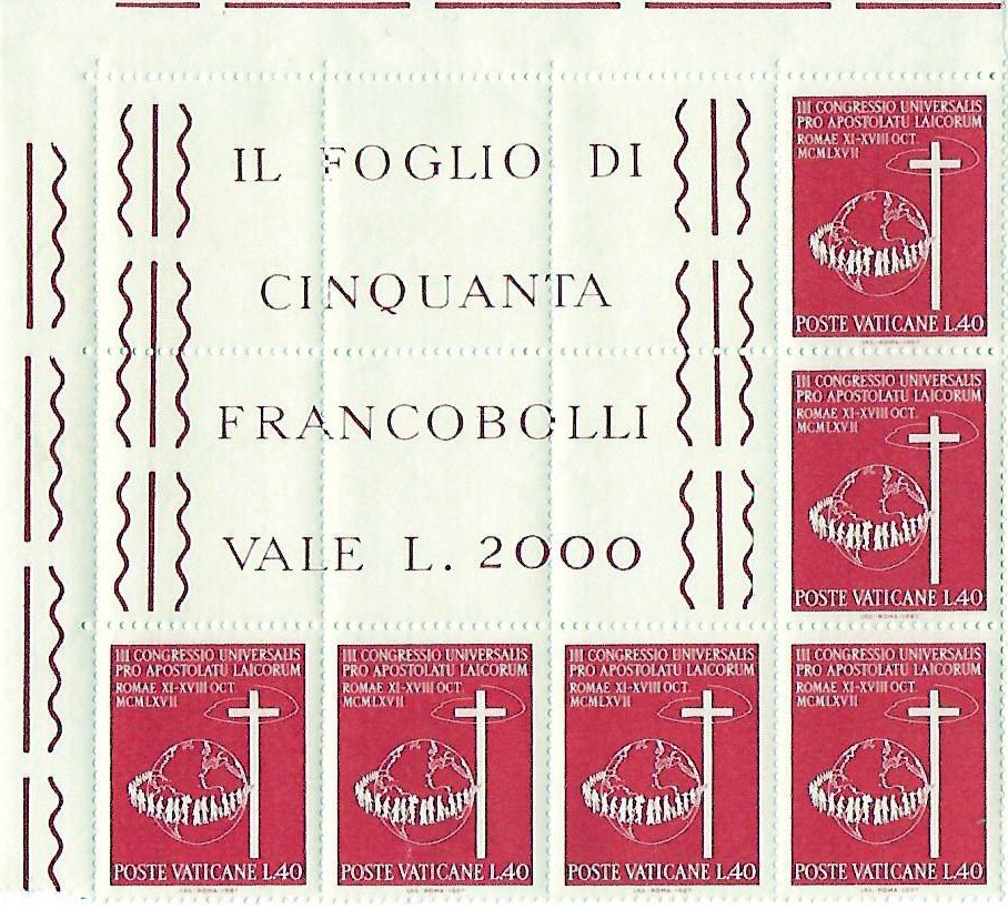 This series of stamps, comprised of three values, was issued on July 2, 1976 to commemorate the Congress to be held in Philadelphia from August 1 - 8. The 150-lire stamp, expressing the universal aspect of the Congress, features the Host, an ear of wheat, and the globe of the world. The 200-lire stamp reproduces the emblem adopted by the Congress, with two hands supporting the Host. The 400 lire, as an expression of the hunger for the Eucharist, reproduces human figures directing their gaze and stretching out their hands towards the Host. They are all vertical in form, measure 30 x40 mm., have 13-1/4 x 14 perforations, and are printed in sheets of 40. They are printed by copper engraving in several colors on white glossy paper, and done by the Polygraphic Institute of the Italian State. The indication of the value is on the top and beneath is the inscription PHILADELPHIA 1976. Around the margin is printed XLI CONGRESSO EUCARISTICO INTERNAZIONALE, and below, the words POSTE VATICANE. Designed and engraved by Tullio Mele. the printing amounts to 1,350,000 complete sets.