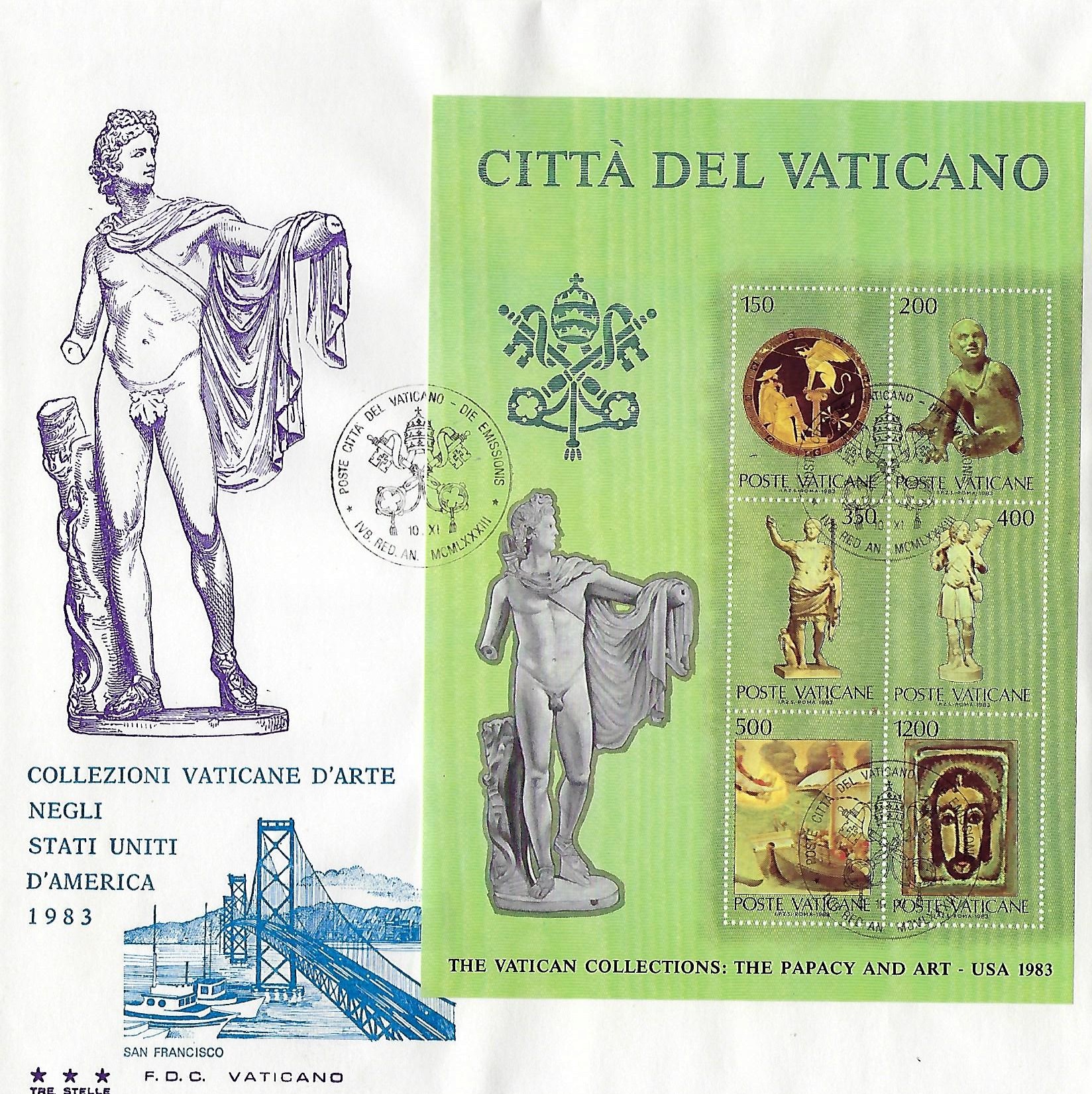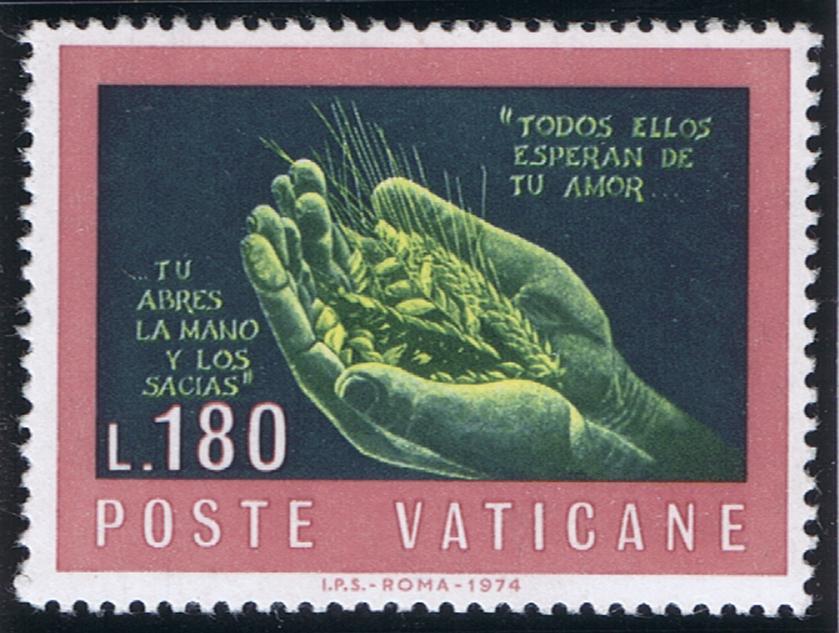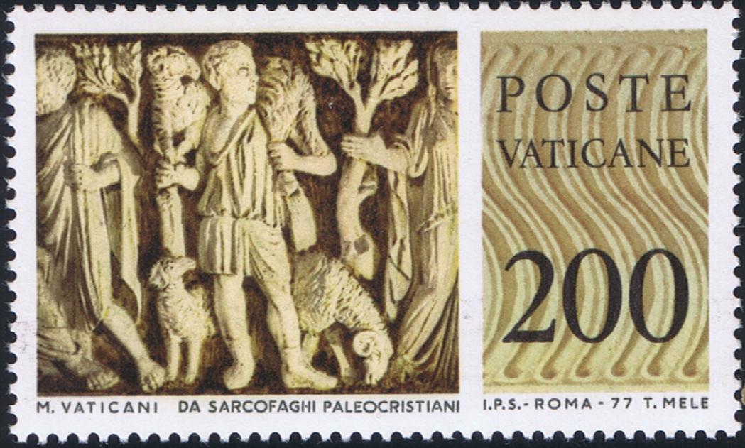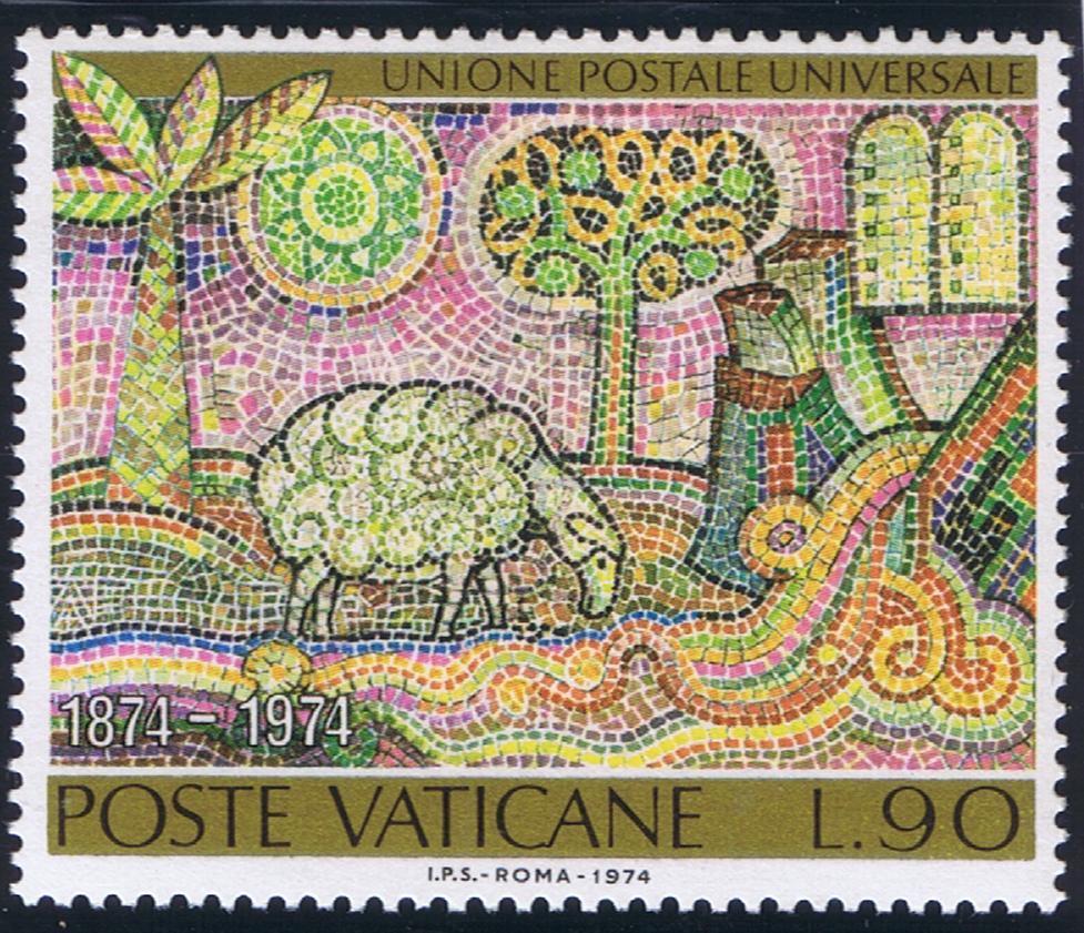 Vatican issued three stamps Oct. 8, 1970, commemorating the 25th anniversary of the founding of the United Nations. L.20 is from Michaelangelo's "Creation of Adam" on the ceiling of the Sistine Chapel. L.90 is the head of Eve from the "Fall of Adam and Eve" by Michaelangelo on the ceiling of the Sistine Chapel. (Cf. Vatican Notes Vo. XV, 01, pp.2-4). These two subjects signify the unity of the human race in its common origin, Adam and Eve. L. 220, an olive branch, symbolic of peace, the purpose of the UN. A special FD cancel consists of a single circle with ONU (UN) at the top with the UN symbol, the dates 1945 1970 indicating the 25th anniversary. The date 8-X-70 indicates the date of the First Day (prima die), and Poste Citta Del Vaticano, indicates the country of origin.
