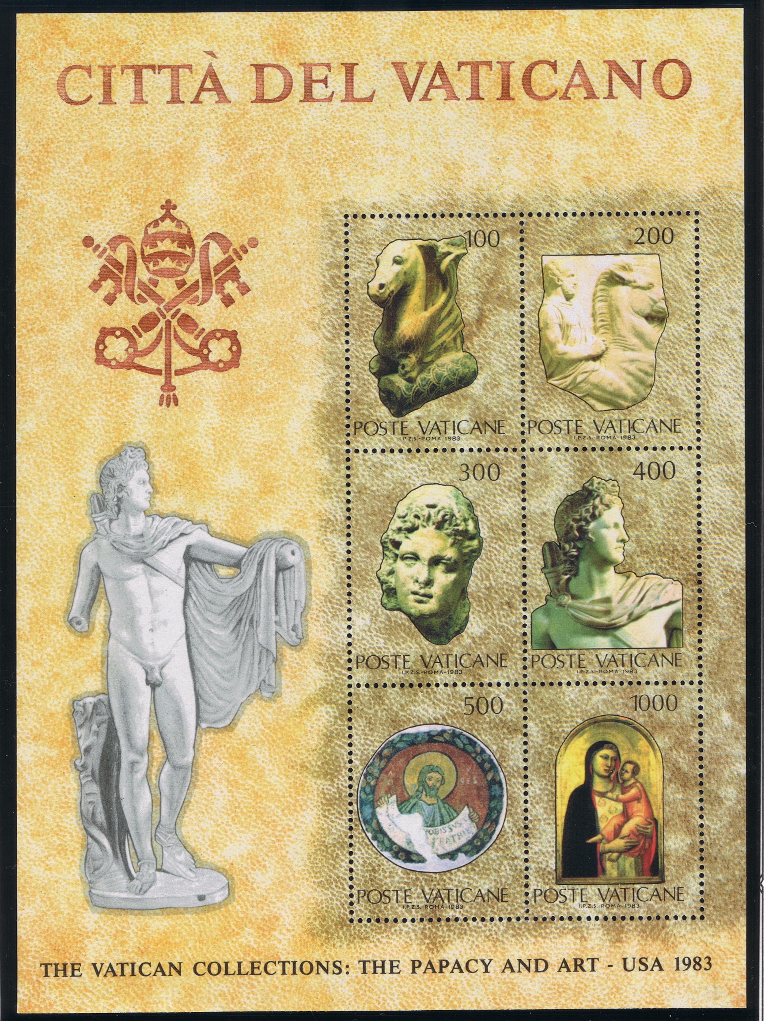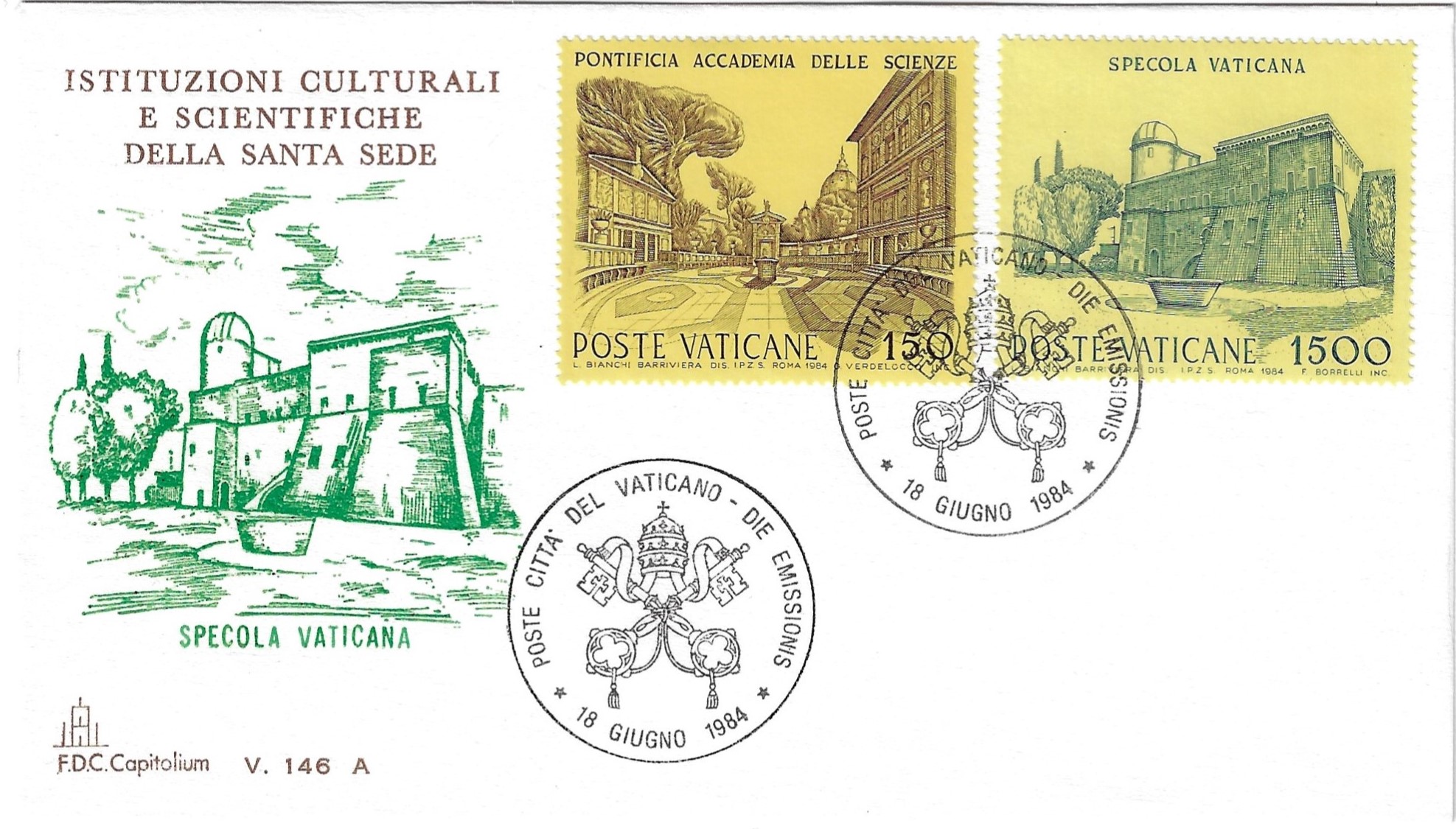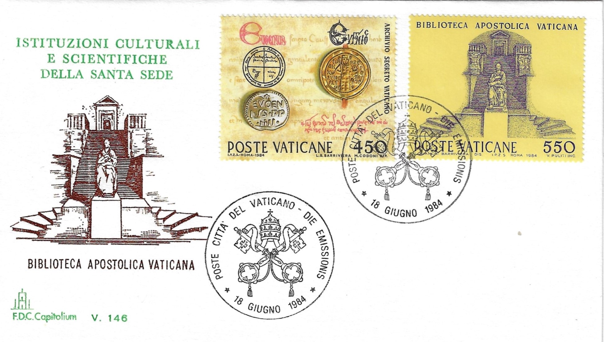 On June 18 1984, Vatican City issued a series of four stamps honoring cultural and scientific institutions of the Holy See. The denominations and subjects are as follows: