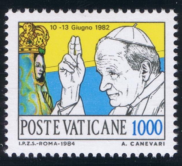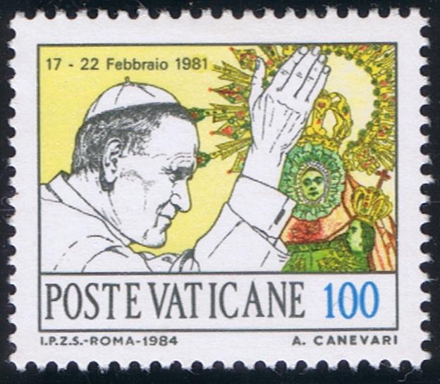 In the center of the Vatican stamp at L.150 is the image of the miraculous Madonna at Czestochowa, Queen of Poland. According to a legend the picture was painted by St. Luke. Thousands of pilgrims come each year to this shrine to beg the Blessed Virgin's intercession. (Cf. Vatican Scott #216-18. Cf. Vatican Notes, Vol. IX, 41, pp.11-12- July-August 1960).