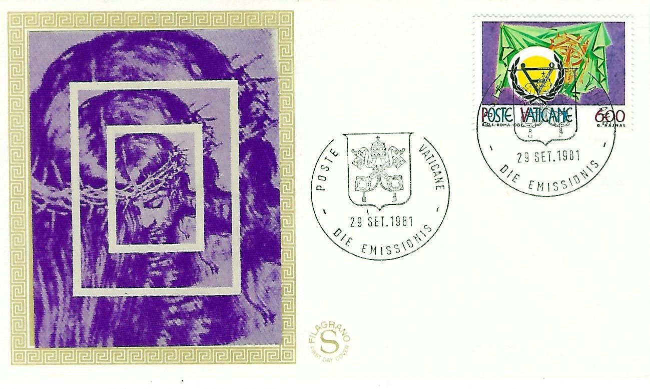 On October 11, 1966, the Vatican issued six stamps to mark the closing of the II Vatican Council. The inscription around three sides of the stamp is translated: THE II VATICAN ECUMENICAL COUNCIL CLOSED IN THE YEAR 1965. The special First Day Cancellation is the one that has been in use for this purpose for the past year.