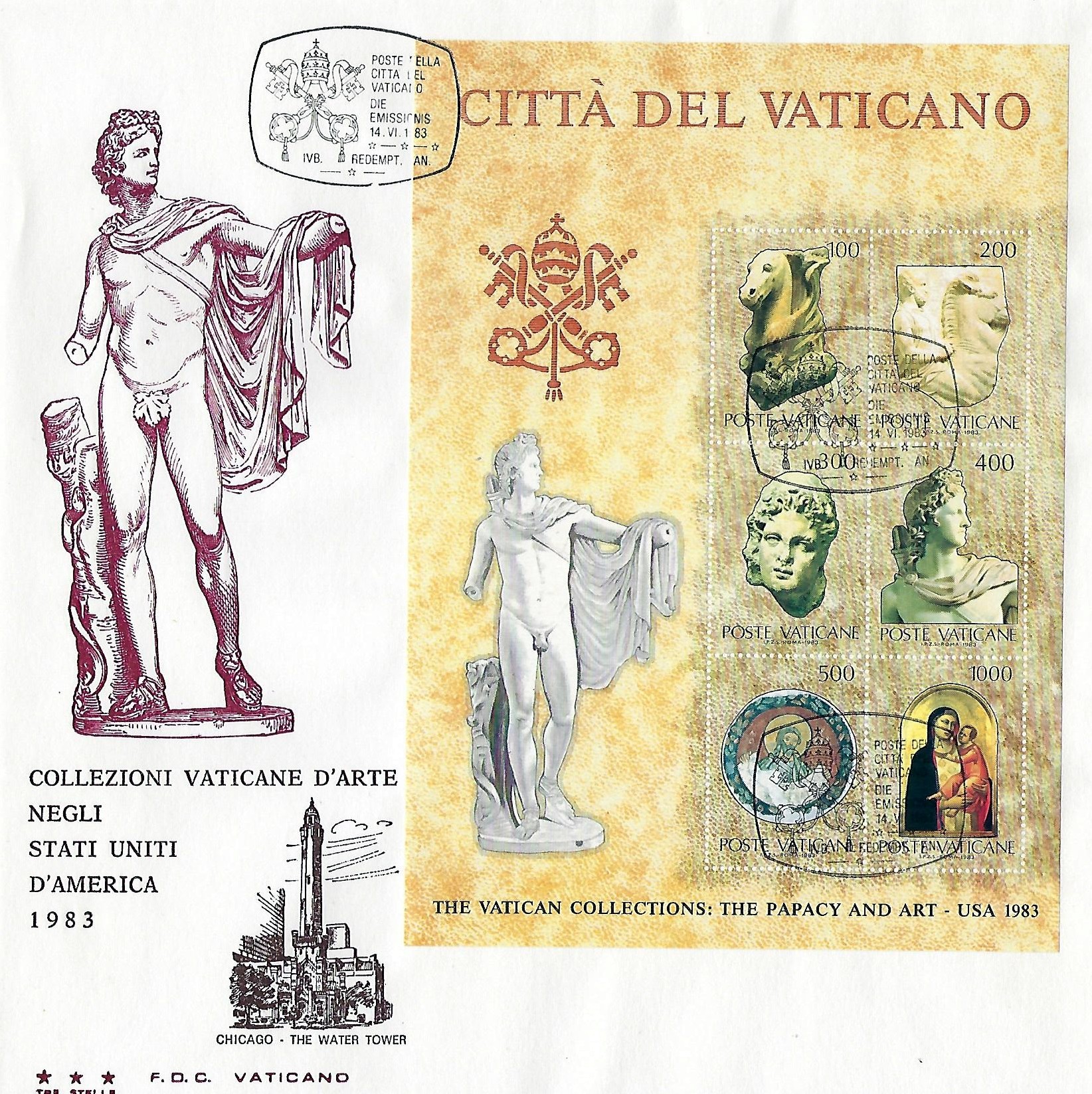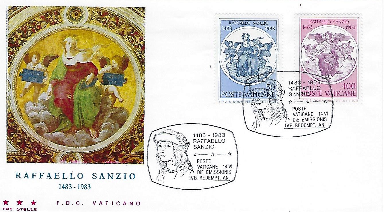 On June 14th, 1983, Vatican City issued a series of four stamps to commemorate the fifth centenary of the Italian Renaissance painter Raphael Sanzio. The stamps depict four "allegories" painted by Raphael on the vault of the Stanza della Segnatura (Room of the Segnatura) at the Vatican. The denominations and subjects are as follows: