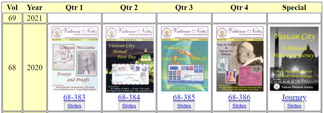 You will notice below the Volume-Issue is a button titled ‘Slides’. Click on the ‘Slides’ button and a slide show will begin displaying the stamp images featured in that issue of the Vatican Notes.