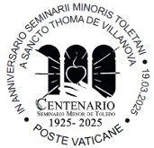 To mark the 100th anniversary of the founding of the Minor Seminary “Santo Tomás de Villanueva” in Toledo, the Vatican Postal and Philatelic Service issued a special commemorative postmark on March 19, 2025. This circular cancellation, measuring 38 mm in diameter, features the official centenary logo of the seminary. Surrounding the emblem are the inscriptions: “IN ANNIVERSARIO SEMINARII MINORIS TOLETANI A SANCTO THOMA DE VILLANOVA”, the date “19.03.2025”, and the designation “POSTE VATICANE”. The postmark not only honors the seminary’s century-long mission of priestly formation but also pays tribute to its namesake, Saint Thomas of Villanova.