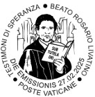 The special postmark (annullo speciale) issued on the same day as the stamp serves as both a philatelic and spiritual seal. Circular in shape and 38 mm in diameter, it features a stylized depiction of Livatino holding his diary, with architectural elements of the Agrigento Cathedral in the background. The inscriptions—TESTIMONI DI SPERANZA, BEATO ROSARIO LIVATINO, POSTE VATICANE, and DIE EMISSIONIS 27.02.2025—frame the image with solemn dignity.