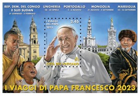 ![]() The Vatican’s commemorative miniature sheet issued on November 4, 2024, celebrates Pope Francis’ apostolic journeys in 2023 by artistically representing each visited country through symbolic imagery. The stamp, with a face value of €2.45, features the Pope in his characteristic gesture of blessing, surrounded by emblematic visuals from each destination. Among these, Mongolia is uniquely represented by a figure dressed in traditional local attire, highlighting the cultural identity of the Mongolian people. This choice reflects the Pope’s emphasis during his visit (August 31 – September 4) on the importance of charity, mercy, and volunteerism offered freely to those in need. Complementing the stamp is a special circular postmark (diameter: 38 mm), which depicts the Holy Father in prayer holding a cross—an image inspired by a photograph taken during the Mongolian visit. The postmark includes the inscriptions: “I VIAGGI DI PAPA FRANCESCO NEL MONDO 2023,” “POSTE VATICANE,” and “DIE EMISSIONIS 04.11.2024.” This philatelic issue not only honors the Pope’s global outreach but also serves as a visual narrative of his mission of peace, unity, and compassion across diverse cultures. Reference • Exaudi Staff. “New Vatican Philatelic Issues in 2024: Travels and Anniversaries.”Exaudi, 5 Nov. 2024 |