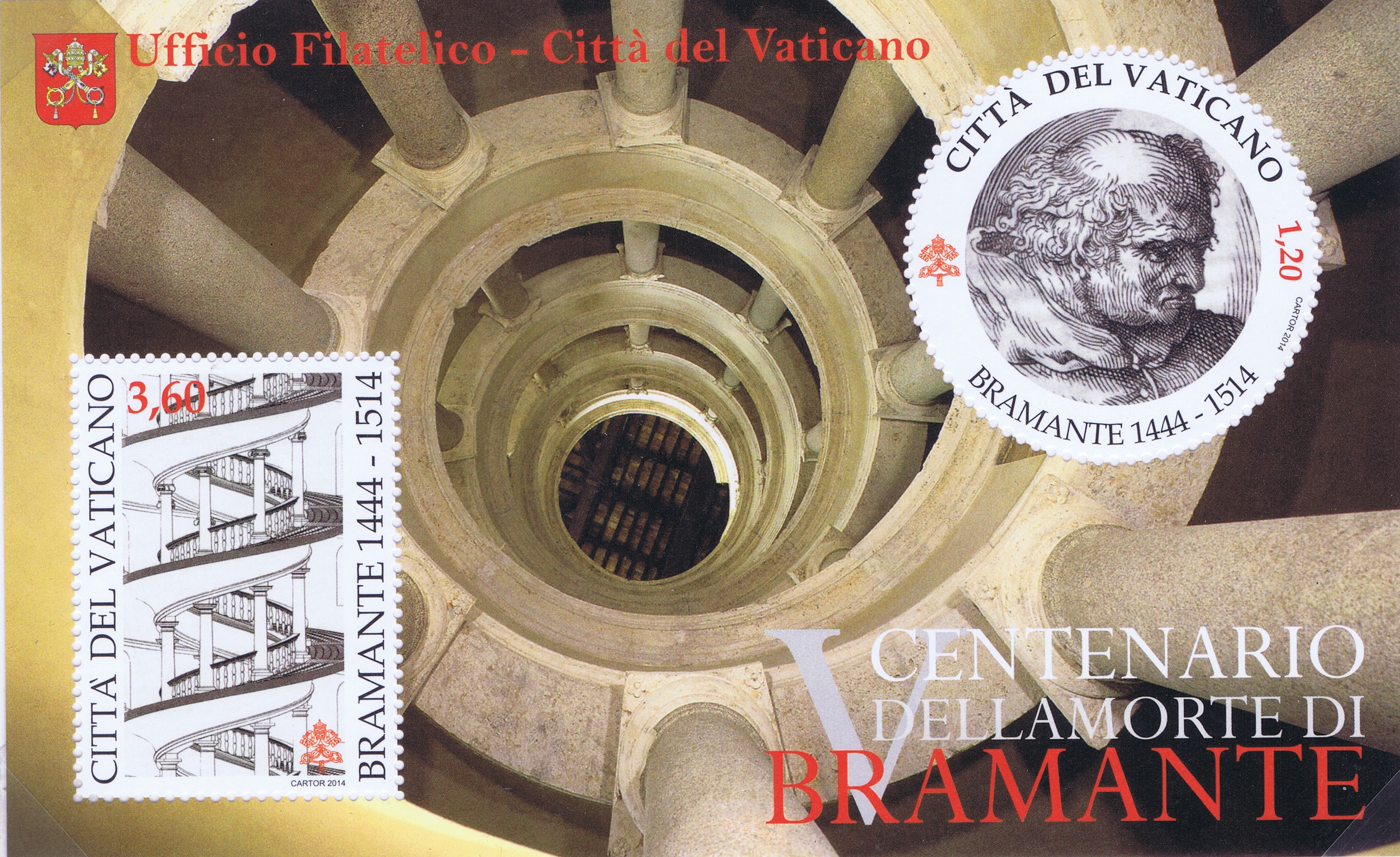 Answer: Donato Bramante (1444 – 1514), born as Donato di Pascuccio d'Antonio and also known as Bramante Lazzari, was an Italian architect. He introduced Renaissance architecture to Milan and the High Renaissance style to Rome, where his plan for St. Peter's Basilica formed the basis of design executed by Michelangelo. His Tempietto (San Pietro in Montorio) marked the beginning of the High Renaissance in Rome (1502) when Pope Julius II appointed him to build a sanctuary over the spot where Peter was buried. Click Here to view more information on Donato Bramante. Vatican Notes Volume: 361; Issue: 4; Page: 4; 2014 ![]() Donato Bramante 500th Anniversary Of Death 1568 (2014) |