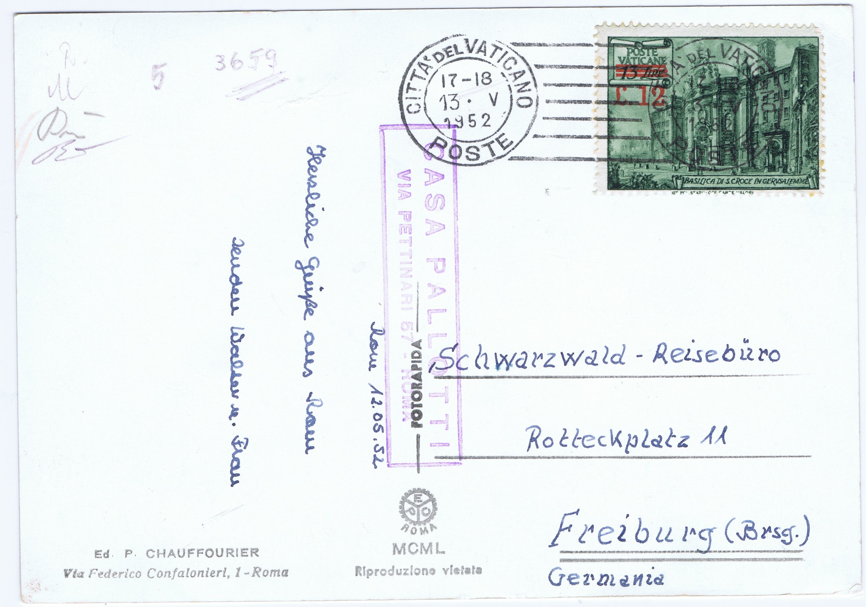 Answer: On February 1, 1952 the Vatican Post Office issued a surcharge postage stamp to be used for picture postcards (with a greeting message of 5 words or less) and printed matter (weighing less than 50 grams) sent to countries other than Italy. The rate remained in effect until September 30, 1957. See also: • Greg Pirozzi, 12 Lire Basilica Surcharge, Vatican Stamps, Volume 39 Issue 5, 1991, Page 7 • Anonymous, Principal Vatican Postal Rates from 1950 to 1966 (in Lire), Vatican Stamps, Volume 55, Issue 1, 2006, Page: 4 ![]() Postcard with 1952 Scottt # 154 stamp; machine postmark cancellation dated 05/13/1952; the CASA PALLOTTI is a hotel stamp and is not a postal marking; the message on this postcard meets the 5 word or less limit |