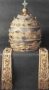 The Papal Tiara or triple crown as it is sometimes called, is a tall headdress of gold cloth ornamented with precious stones, encircled with three coronets and surrounded by a cross. The original tiara consisted of a plain helmet-like cap of white material and was provided with its first circle about 1136 A.D. The second was added during the Pontificate of Pope Boniface VIII (1294-1303). The earliest representation of the tiara with three crowns is found on the effigy of Pope Benedict who died in 1342. The tiara's earliest name Camelaucum (made of camel's hair would indicate it was of Byzantine origin and was probably adopted by the Popes from the Byzantine court headdress, the Kamelaukion.