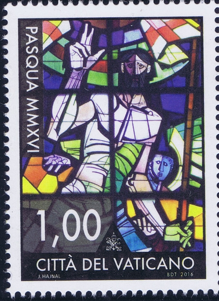 Answer: The 2016 the Easter stamp images are from stain glass windows for the parish church of St. Anges Merci in Milan by Italo-Hungarian Janos Hajnal (1913-2010). They were paid for by a donation by a private individual, in memory of his son.