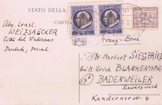 Answer: This rather fascinating story come from Vatican Notes. On June 24th, 1943 Ernst Heinrich Freiherr von Weizsäcker was appointed German ambassador to the Holy See in Rome at his own request. According to his own statements, he had a friendly relationship with Pope Pius XII. With the liberation of Rome in June 1944, the German embassy was moved to the Vatican, where Weizsäcker remained until August 1946 even after Germany's capitulation. The postcard below is sent by Weizacket to Badenweiler Germany (then an occupied French zone).