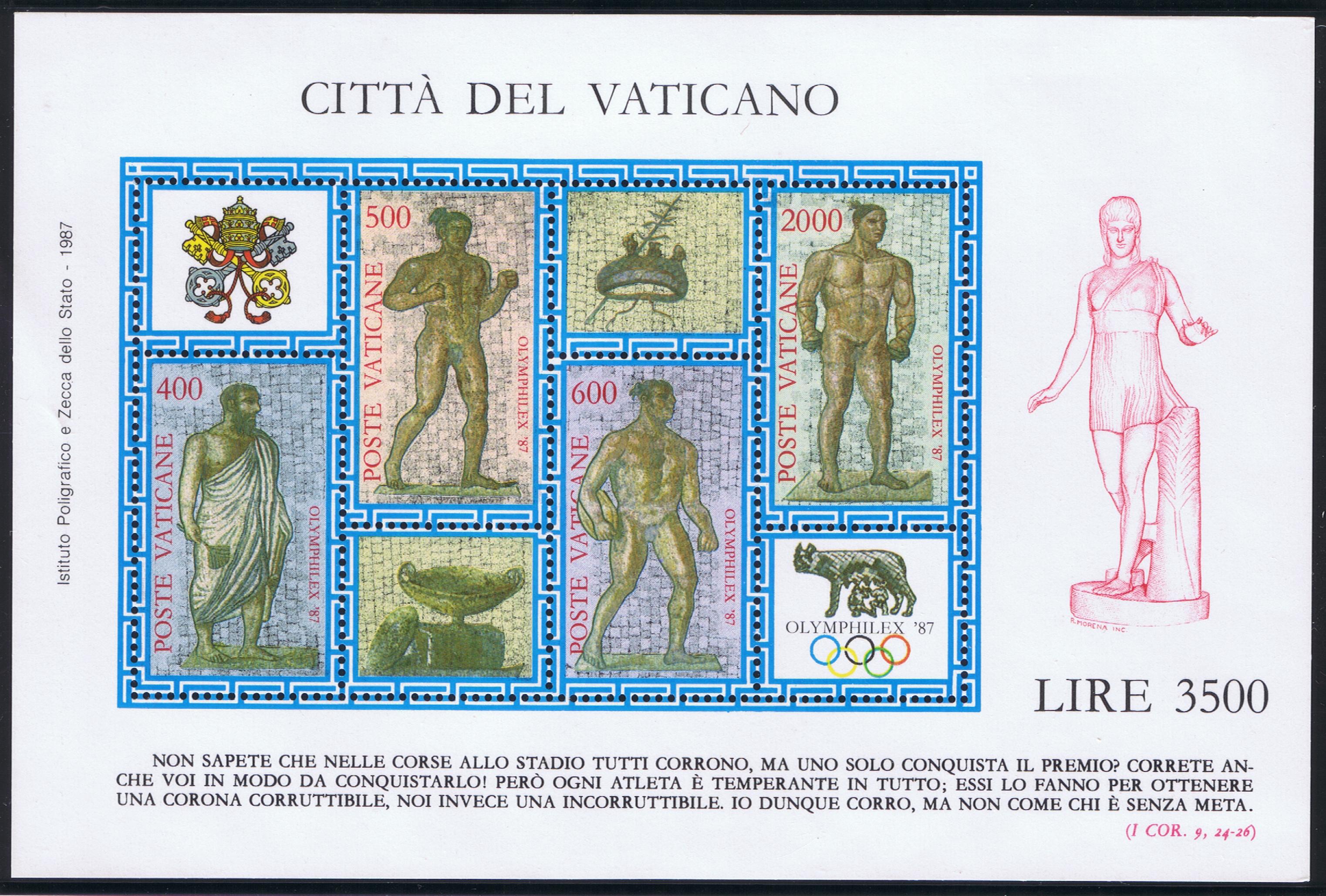 Answer: St. Paul states that all athletes exercise self-control. The four stamps are images from the mosaics taken from the Baths of Caracalla which are preserved by the Vatican Museums. Material from these baths were re-used in later buildings of Rome. .