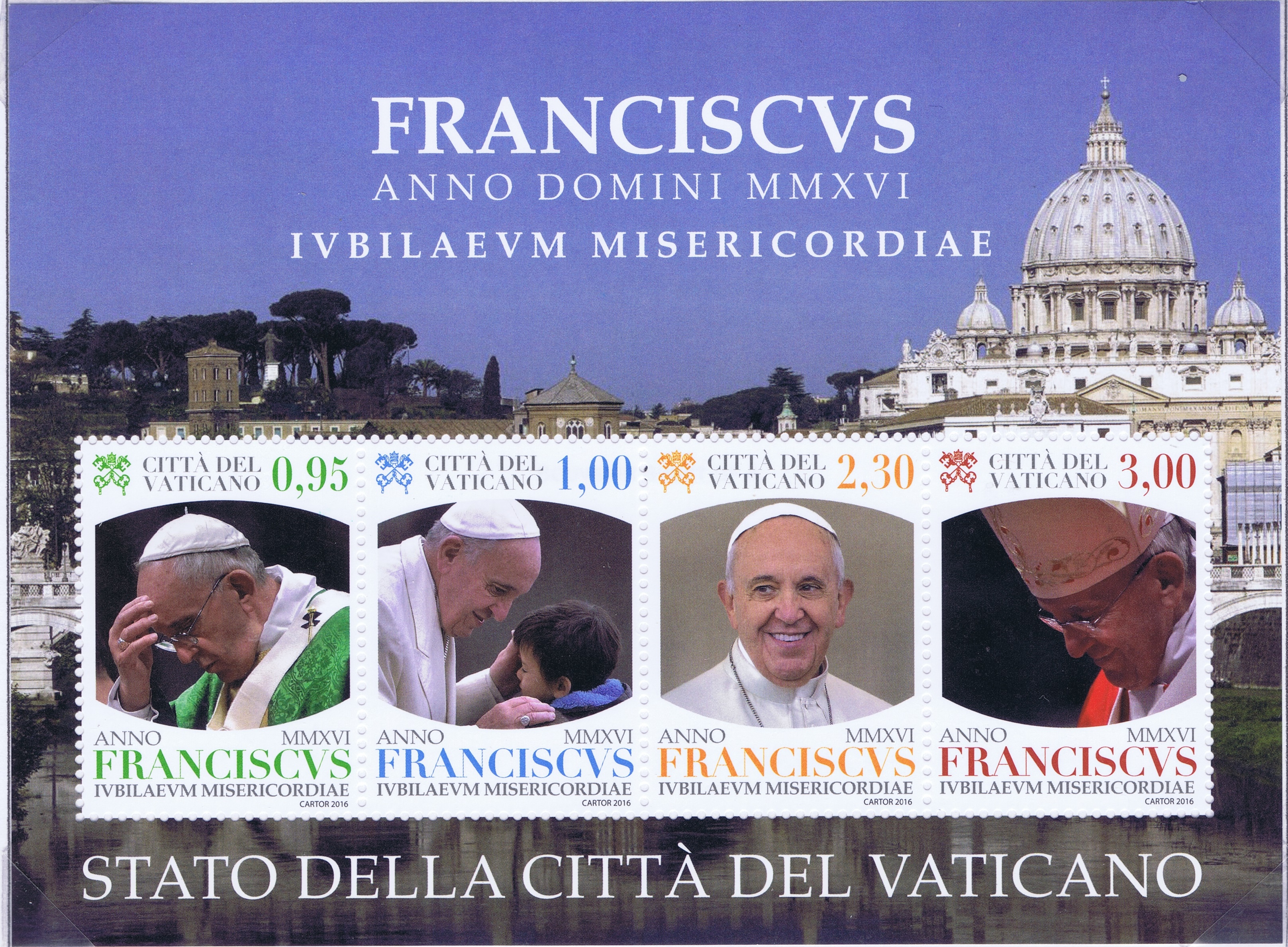 Answer: Each year the Vatican Post Office has issued a set of stamps honoring the Pontificate of Pope Francis. This is the 4th in the series. * Jorge Mario Bergoglio (Pope Francis) was born on 17 December 1936 in Flores, a neighborhood of Buenos Aires, Argentina. He was the eldest of five children of Mario José Bergoglio and Regina María Sívori. Mario Bergoglio was an Italian immigrant accountant born in Portacomaro in Italy's Piedmont region. Regina Sívori was born in Buenos Aires to a family of northern Italian origin. 2016 with Pope Francis: Throughout the three years of his Pontificate, Pope Francis has shown that he does not address problems through laws, but by "initiating processes" involving many people. (Source: www.RomeReports.com) 1. On his first day as pope, he personally collected his luggage and paid for his own hotel room. That demonstrated that everyone should take responsibility for themselves, and that the age of privileges was over. 2. He settled in "Casa Santa Marta." The Pope does not want to live in an ivory tower. 3. Pope appeals to the infinite value of every human being, and he shows it by hugging and smiling with those displaced in society. 4. He has not visited the parishes in the center of Rome, but instead has gone to the marginalized churches. 5. When large meetings include testimonies, the Pope does not read his prepared speech, but changes it based on what he has heard. 6. He answers questions freely, without fear of being wrong, and is unafraid to confront sensitive issues. 7. He has created a council of 9 Cardinals that help him govern and ensure that any bishop has direct access to the Pope. He has instituted a commission to prevent sexual abuse cases; and he has refined the Vatican bank. 'PONTIFICATE OF POPE FRANCIS - 2016'