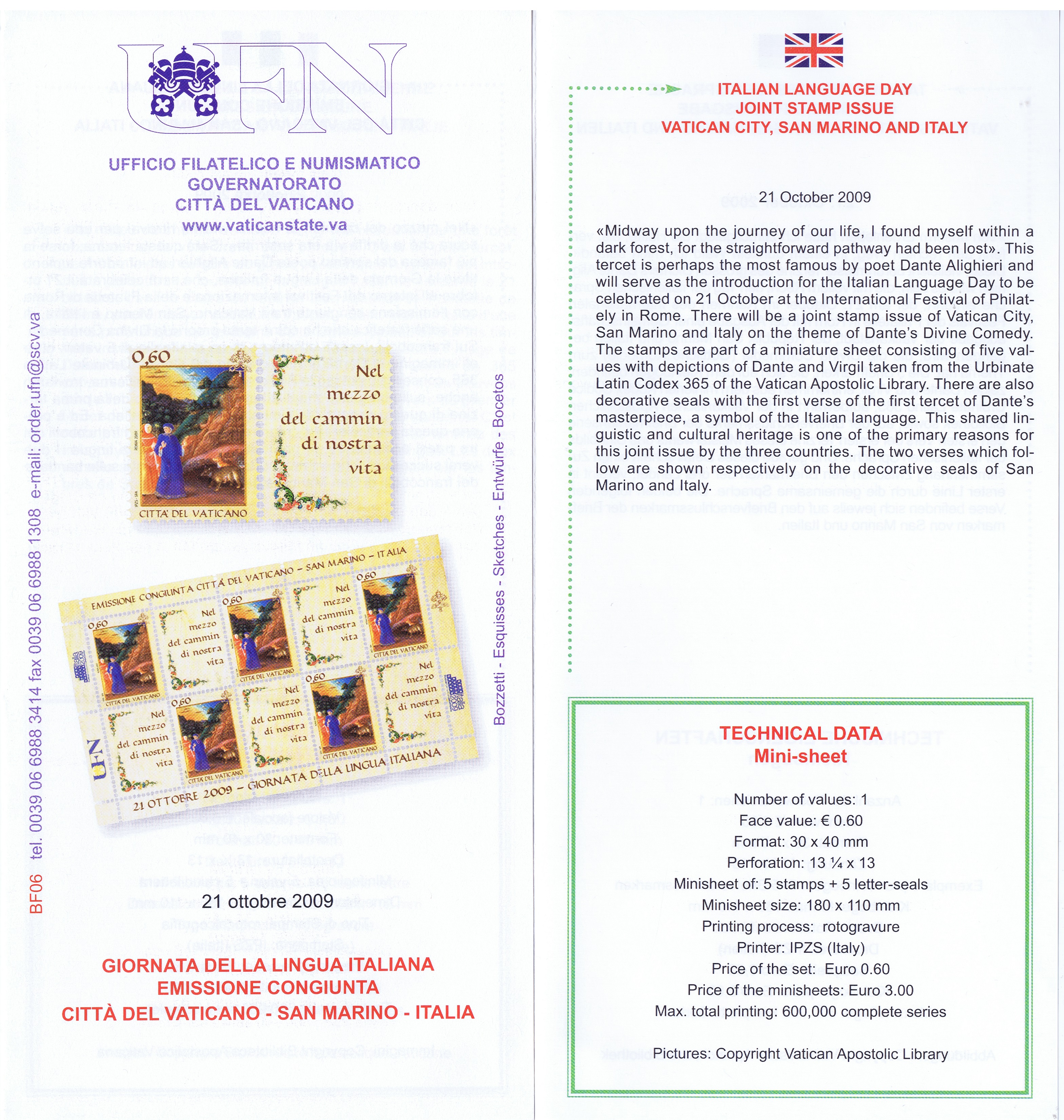 Number: 1426M Date Issued: 2009-10-21 Descriptive Name: Italian Language Day - Virgil & Dante - Mini Sheet Face value: 5 x €0,60 Color: multi Perforation: 13-1/4 x 13 Printer: Instito Poligrafico e Zecca dello Strata Italiano Click to seeUFN Bulletin Announcement
