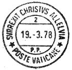 I-189![]() ![]() | 1 | P | CHRISTVS NATVS EST ALLEVIA (CHRIST is born Hallejujah) - 1984 | dash | POSTE VATICANE | Christmas 1984 All black | VN Ref Examples | ||