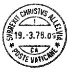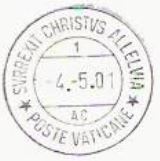 I-241![]() ![]() | cancel hour | 2000 | IVILAEM A.D. 2--- | star | POSTE VATICANE | Block text: SURREXIT CHRISTUS DE SEPVLCRO ALLELVIA ALLELVIA. length of text 4.2 mm | Easter 2000 - 4/18/2000 tp 5/31/2000 | VN Ref Examples | |