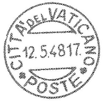 I-11![]() ![]() | 5 vertical lines, 2 corners | 6 vertical lines, 2 corners | CITTA del VATICANO | star | POSTE | 5/19/1948 to 5/20/1948 Black ink only. | VN Ref Examples | ||