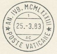 I-180![]() ![]() | 3 | F | AN. IVB. MCMLXXXIII (Jubilee Year 1983) | star | POSTE VATICANE | 03/25/1983 to 3/28/1984 All black | VN Ref Examples | ||