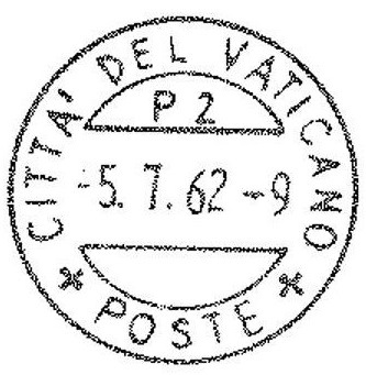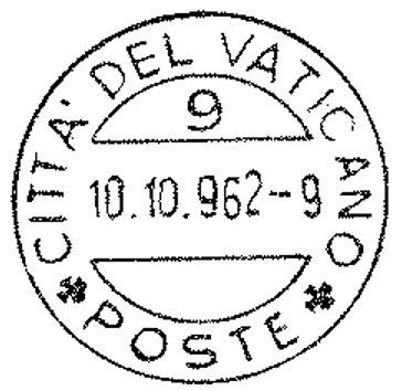 I-45![]() ![]() | Arabic 6 | CITTA DEL VATICANO | Maltese Cross | POSTE | Outer circle damages under O in POSTE | 9/14/1962 to 9/12/1966 Black ink only | VN Ref Examples | ||