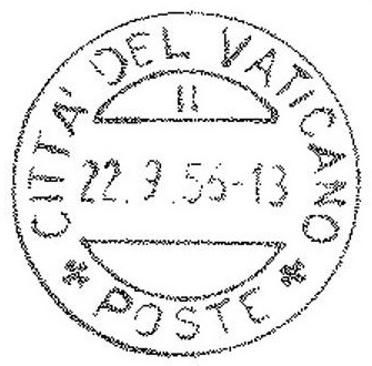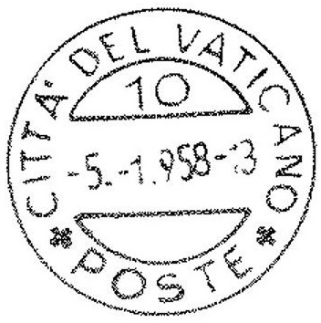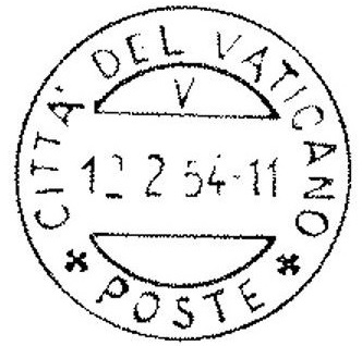 I-29c![]() ![]() | Arabic 10 | CITTA DEL VATICANO | Maltese Cross | POSTE | complete year, no hour on date line | 12/7/1954 | VN Ref Examples | ||