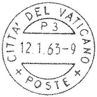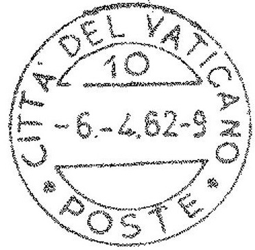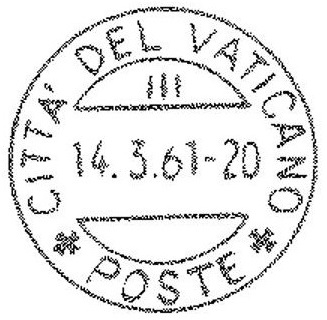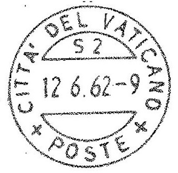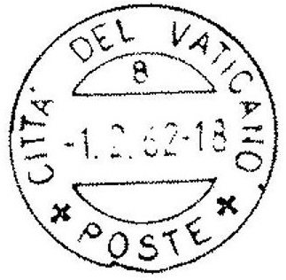I-48![]() ![]() | Arabic 8 | CITTA DEL VATICANO | Maltese Cross | POSTE | Dint in outer circle | 2/1/1962 | VN Ref Examples | ||