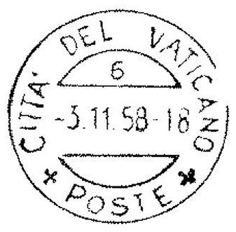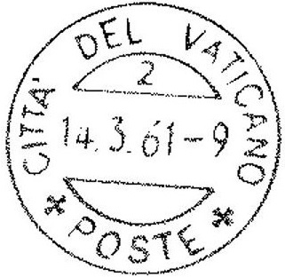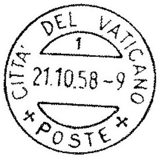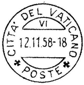 I-42![]() ![]() | Arabic 4 | CITTA DEL VATICANO | Maltese Cross | POSTE | top name spans as shown | 10/28/1958 to 4/23/1966 (Black) 2/28/1961, 3/14/1961, 3/22/1961 (Red) | VN Ref Examples | ||