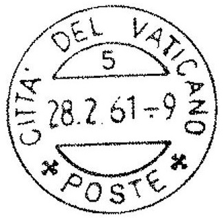 I-43a![]() ![]() | Arabic 5 | CITTA DEL VATICANO | Maltese Cross | POSTE | vertical stroke of the 5 is longer | 10/30/1956 to 12/10/1973 | VN Ref Examples | ||