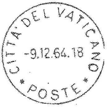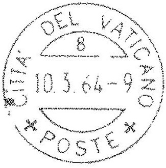I-49![]() ![]() | Arabic 8 | CITTA DEL VATICANO | Maltese Cross | POSTE | broken bottom line of upper moon | 2/10/1964 to 8/22/1964 Black ink only | VN Ref Examples | ||