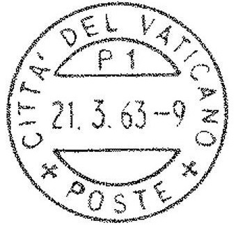 I-29b![]() ![]() | Arabic 10 | CITTA DEL VATICANO | Maltese Cross | POSTE | two digit year | 3/21/1957 to 4/22/1964 | VN Ref Examples | ||