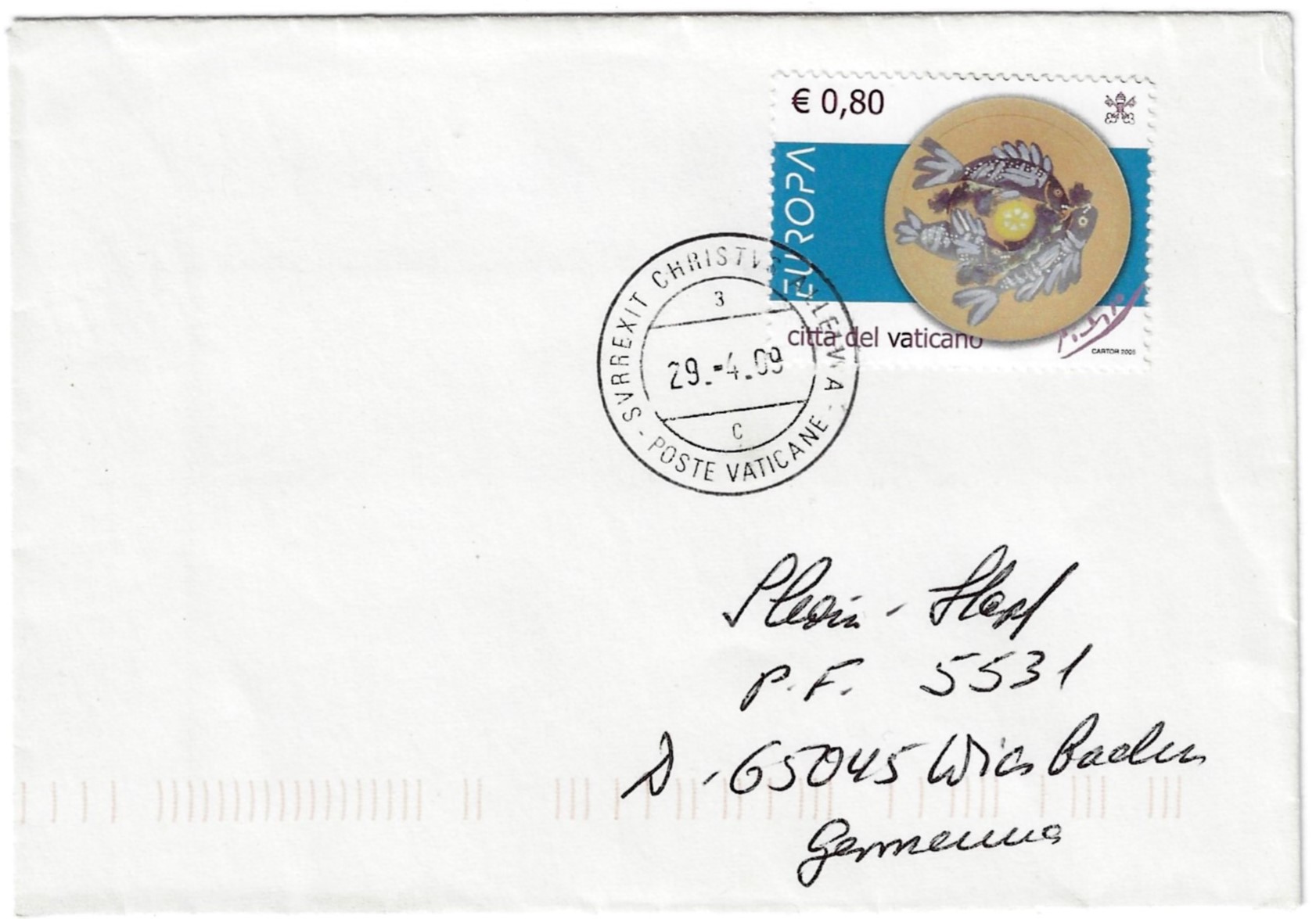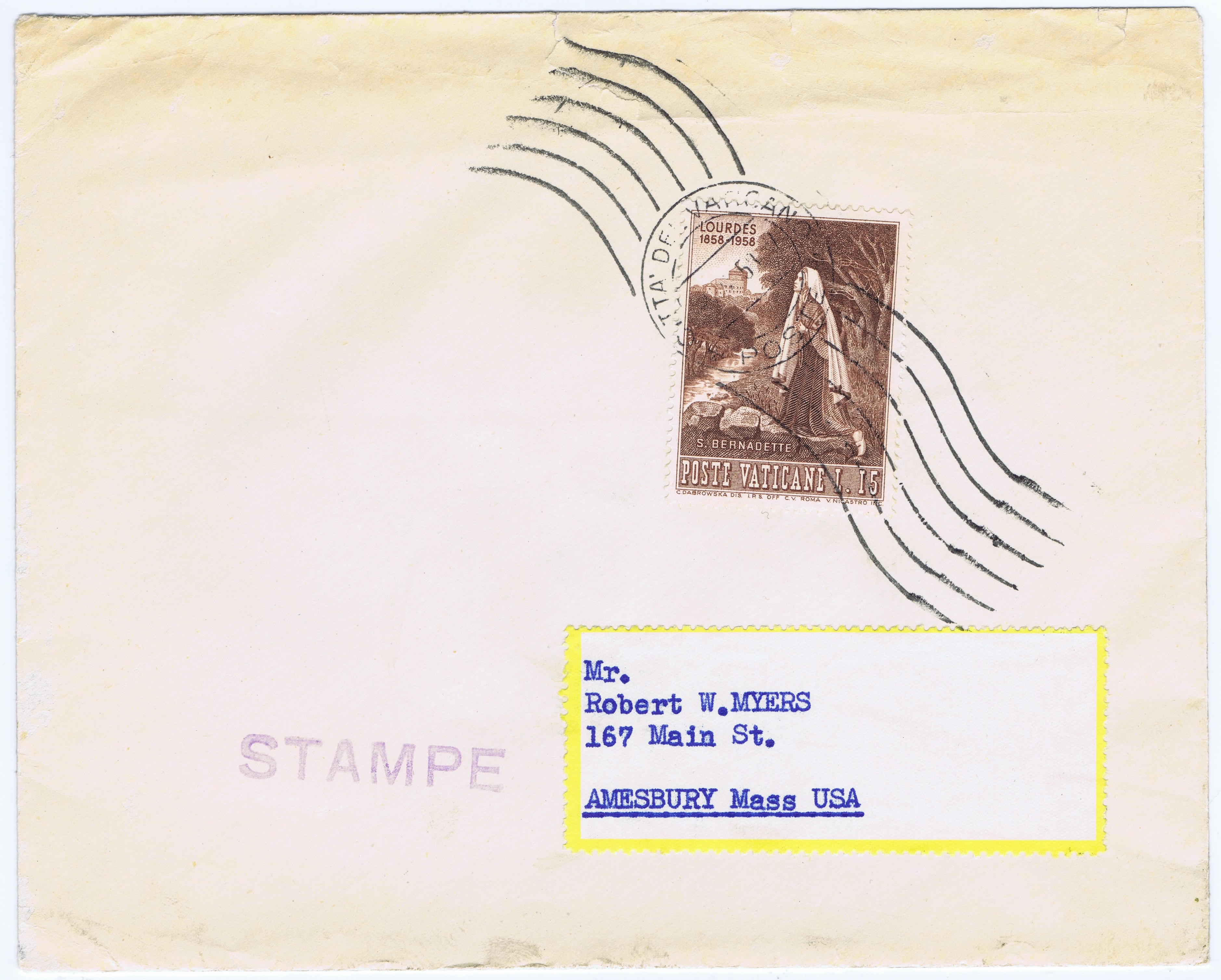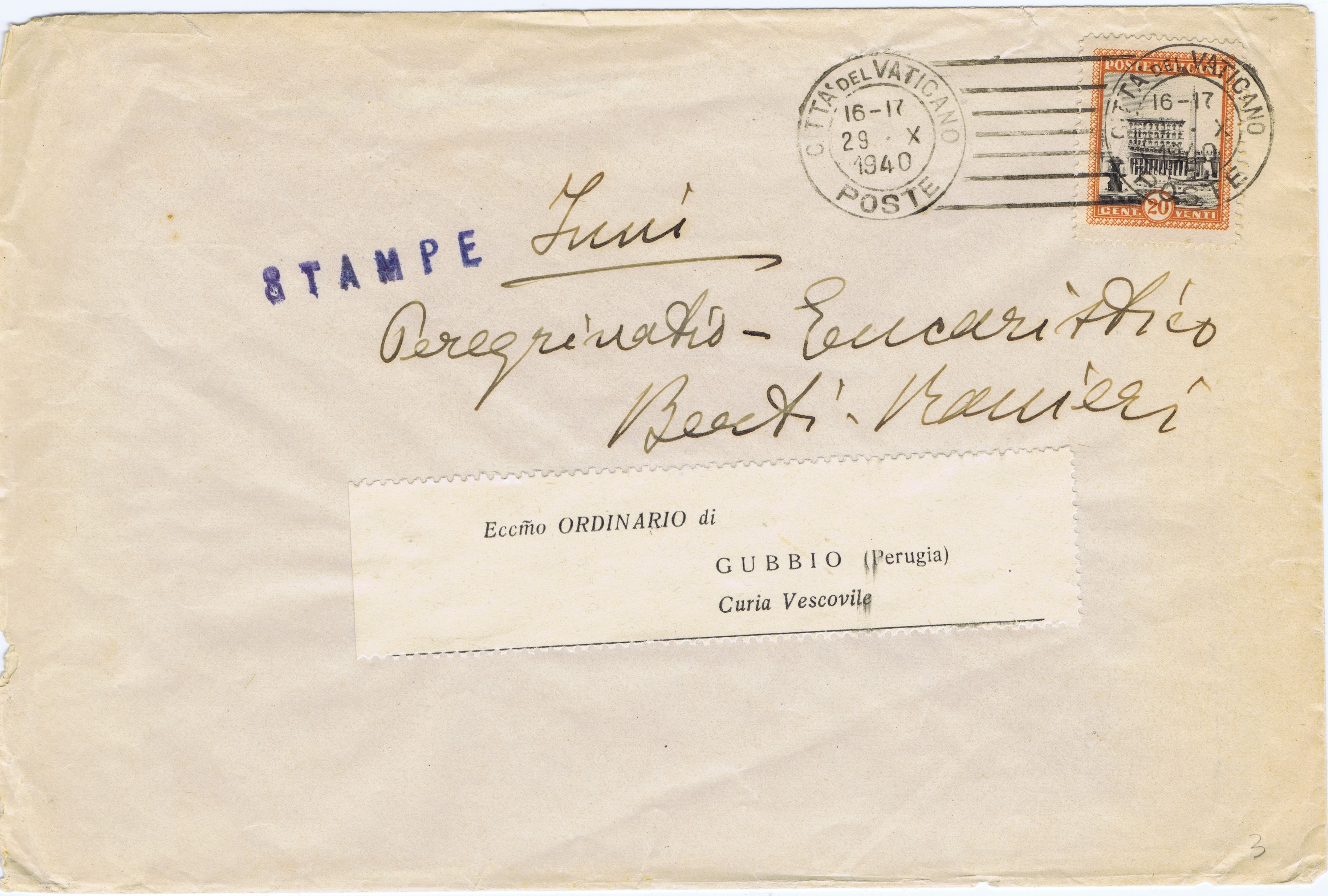 This is a printer matter (stampe) envelope addressed to the ordinary bishop of Gubbio (province of Perugia). The 20c rate pays for printer matter up to 50grams. Nice example with a machine postmark. -