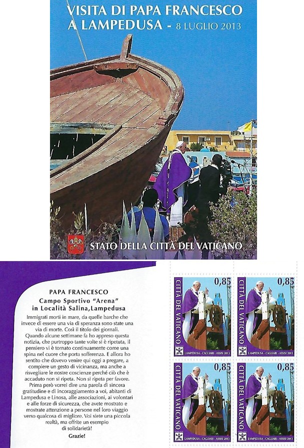 During 2013 Pope Francis traveled to Rio de Janeiro, Lampedusa, Cagliari, and Assisi in Italy. The Vatican issued two stamp designs for the visits. The €0,70 stamp marked the visit to Rio de Janeiro. The €0,85 stamp commemorated the visits to Lampedusa, Cagliari, and Assisi. 150,000 individual stamps were offered in sheets of ten. The €0,85 stamp, which depicts Pope Francis preaching to the crowds, was also available in 60,000 booklets of four stamps (the 23rd booklet issued by the Vatican.) Funds raised from the sale of the Lampedusa booklet were reserved for the Holy Father's work to assist migrants.
