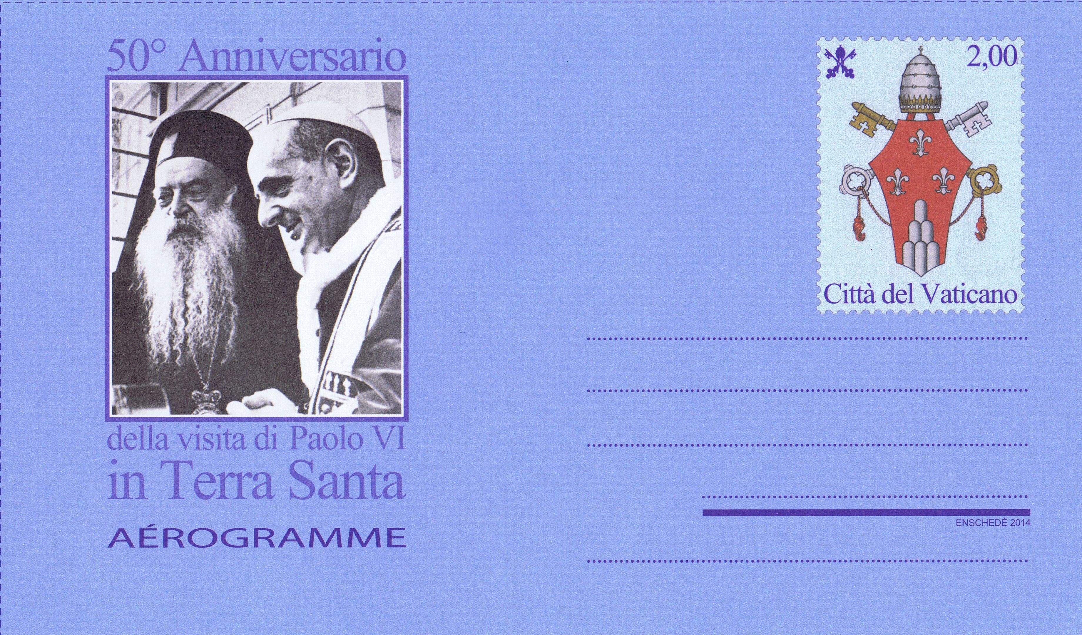 The cachet of the 2014 aerogramme depicts the 50th anniversary of the meeting of Pope Paul VI and Ecumenical Patriarch Athenagoras I during the Pope's visit to the Holy Land 4-6 January 1964. This event was covered in a Vatican Notes article, 2nd Quarter 2012 (see reference below.). Pope and Patriarch net at the Church of the Holy Sepulcher in Jerusalem. The €2,00 postal indicia depicts the coat of arms of Pope Paul VI. Reference: The Pilgrim Pope - The Travels of Pope Paul VI Technical Details: Scott Catalogue - A52 - A52 Date Issued - 21 November 2014 Face Value - €2,00 Perforations - N/A Printing Process - Offset Printer - Joh Enschede (Netherlands) Max Printed - 21,000 |