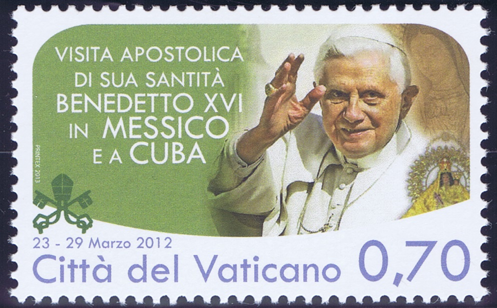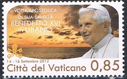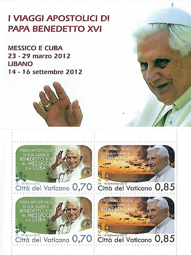 The apostolic travels of Pope Benedict XVI during 2012 are commemorated on two stamps. The €0,70 value recalls the Holy Father's visit to Mexico 23-25 March (and later Cuba). In Mexico he visited the city of León in the state of Guanajuato. During his addresses and at the celebration of Mass, he called for a renewal of evangelism among Spanish-speaking citizens of Latin America. He also offered prayers for hardships suffered by families in Mexico. Benedict then traveled to Cuba, visiting Santiago de Cuba and Havana from March 26-29. His speeches build upon the theme by his predecessor Pope John Paul II during his 1998 visit to Cuba, calling for religious freedom for the Church to carry out its mission. The €0,85 stamp is devoted to Pope Benedict's travels to Lebanon on 14-16 September. He promulgated the Post Synodical Exhortation of the Special Assembly for the Middle East Communion and Witness (2010). The Exhortation was delivered to the Eastern and Latin Patriarchs and Bishops of the Middle East to pursue fidelity to Christianity with ancient roots in a diverse and often troubled region of the Mediterranean. In his presentation at the Beirut City Centre Waterfront on 16 September, Benedict stated. "Dear Church in the Middle East, draw from the source of salvation which became a reality in this unique and beloved land! Follow in the footsteps of your fathers in faith, who by tenacity and fidelity opened up the way for humanity to respond to the revelation of God! Among the wonderful diversity of saints who flourished in your land, look for examples and intercessors who will inspire your response to the Lord's call to walk towards the heavenly Jerusalem..."